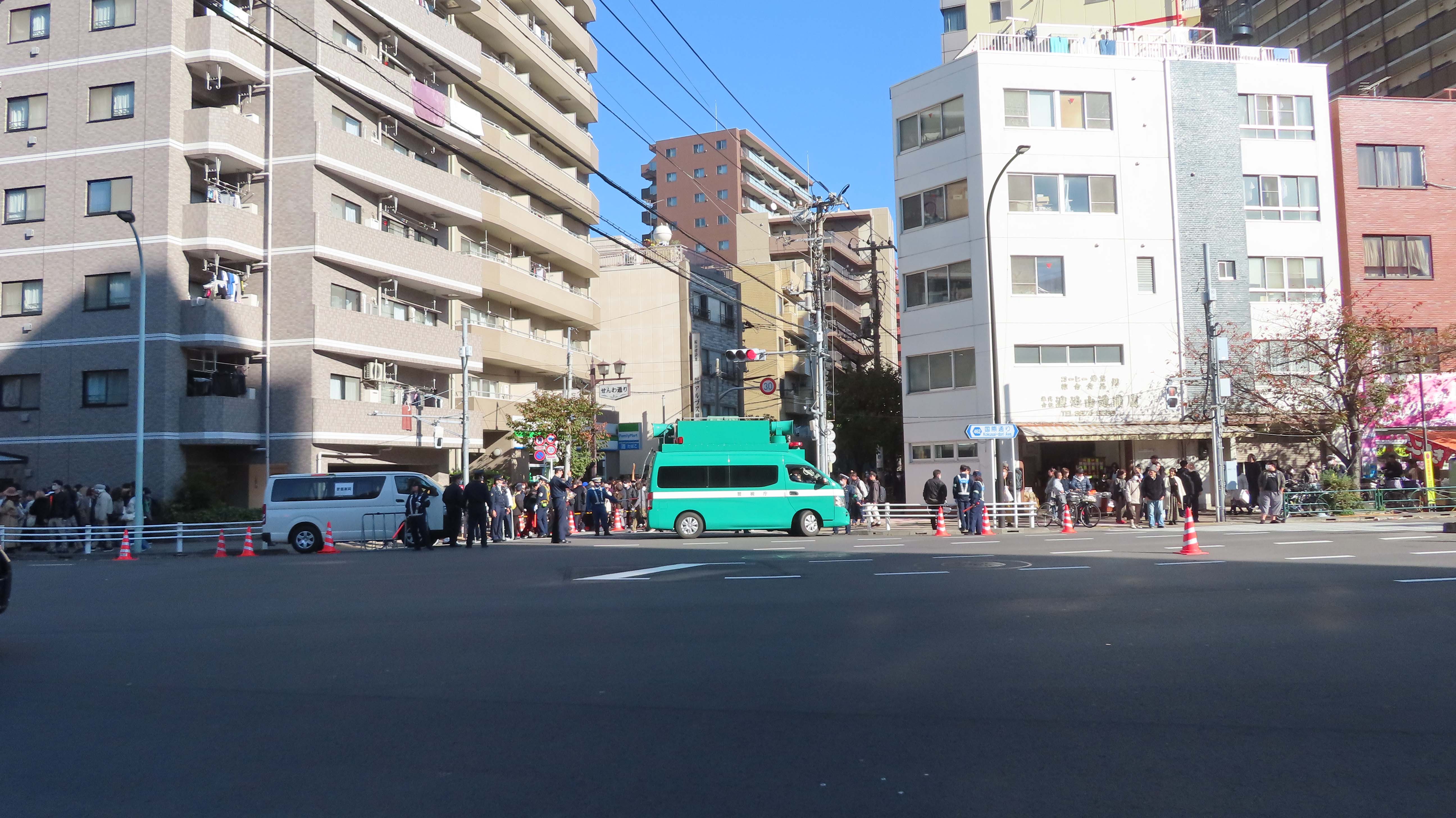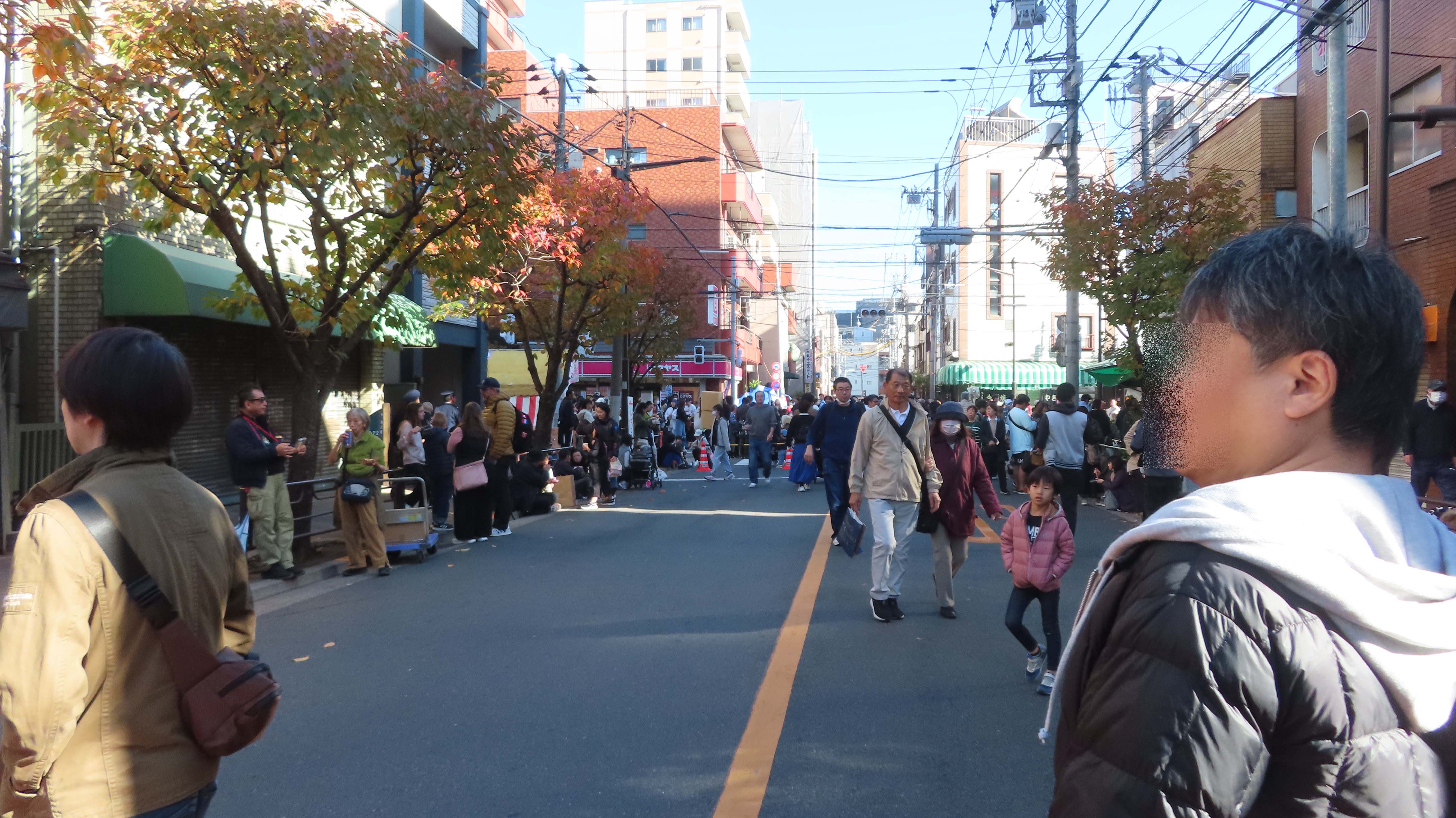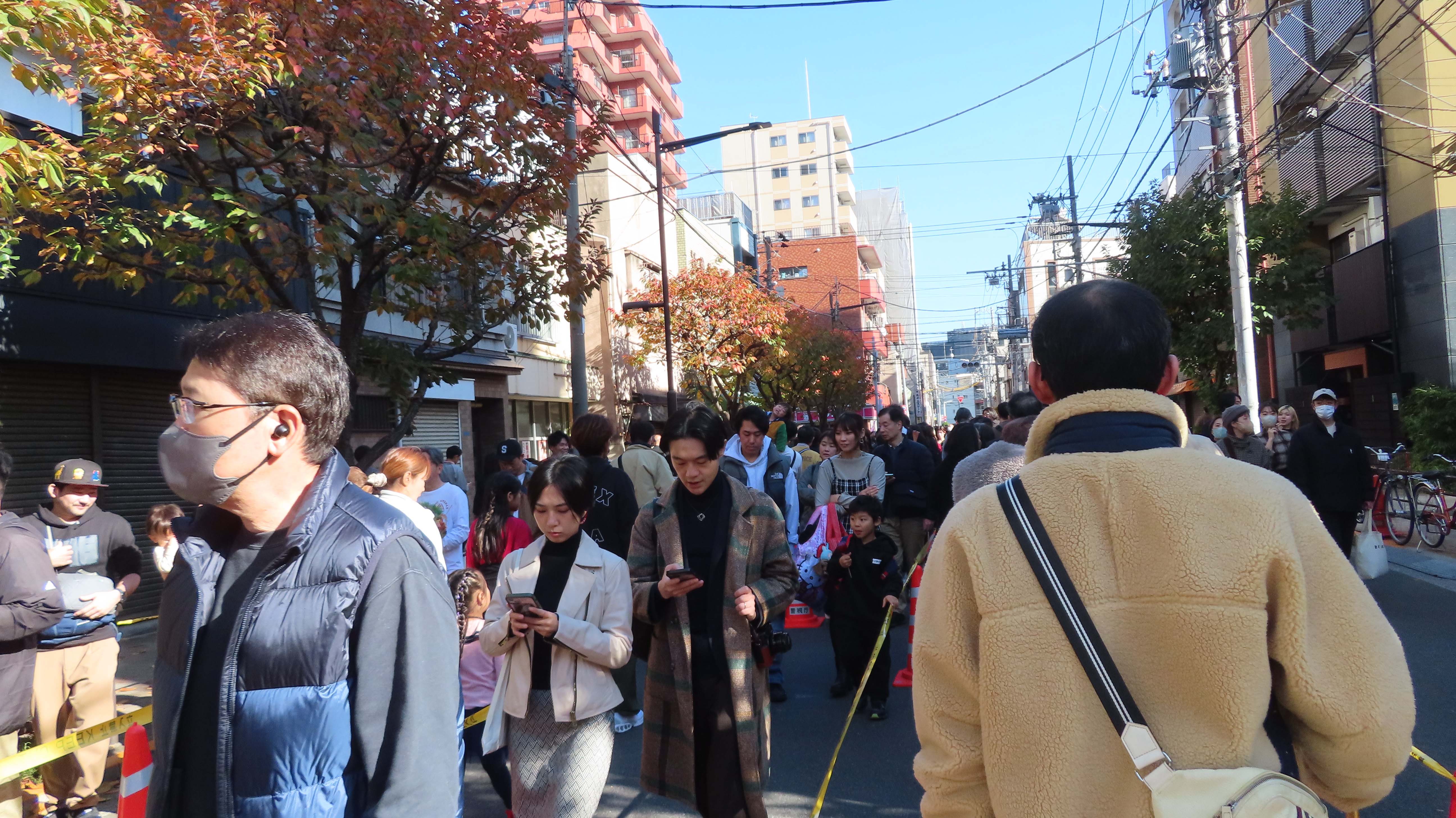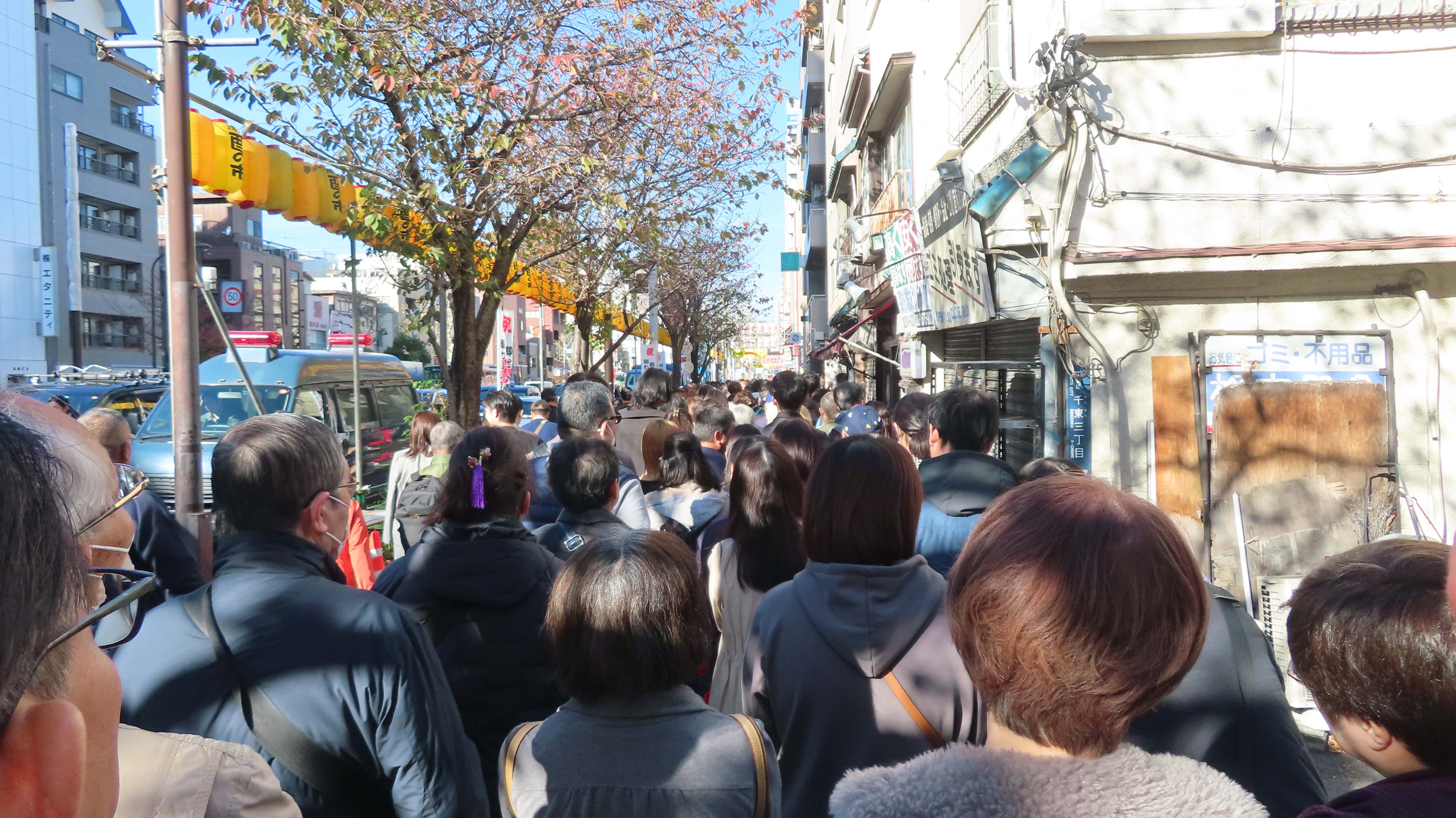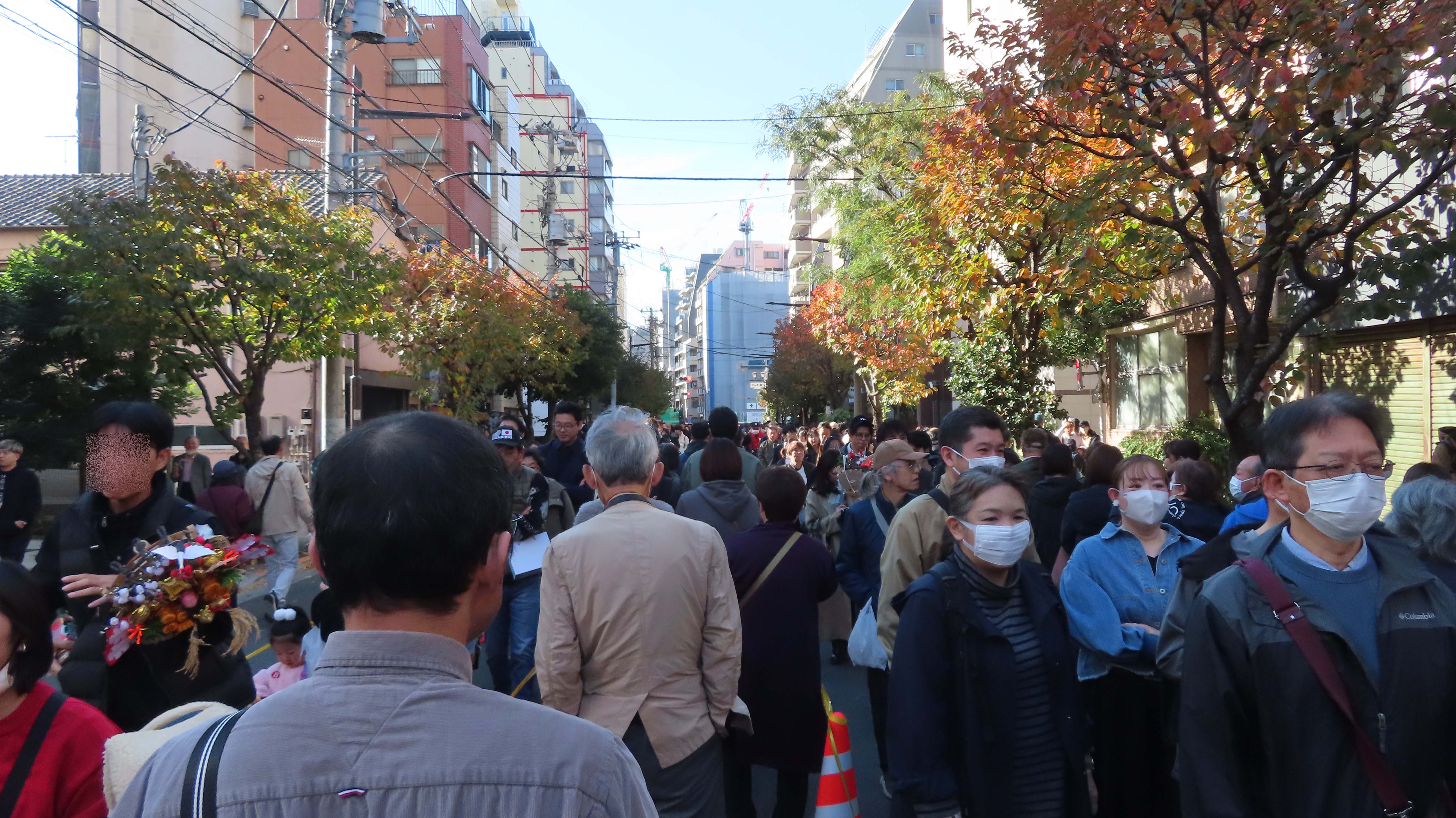 | 交差点で道路封鎖していた。 | 鷲神社に参拝に向かう列に並ぶ。 | カクヤスが見える。 | 暑くて上着を脱いだ。 |