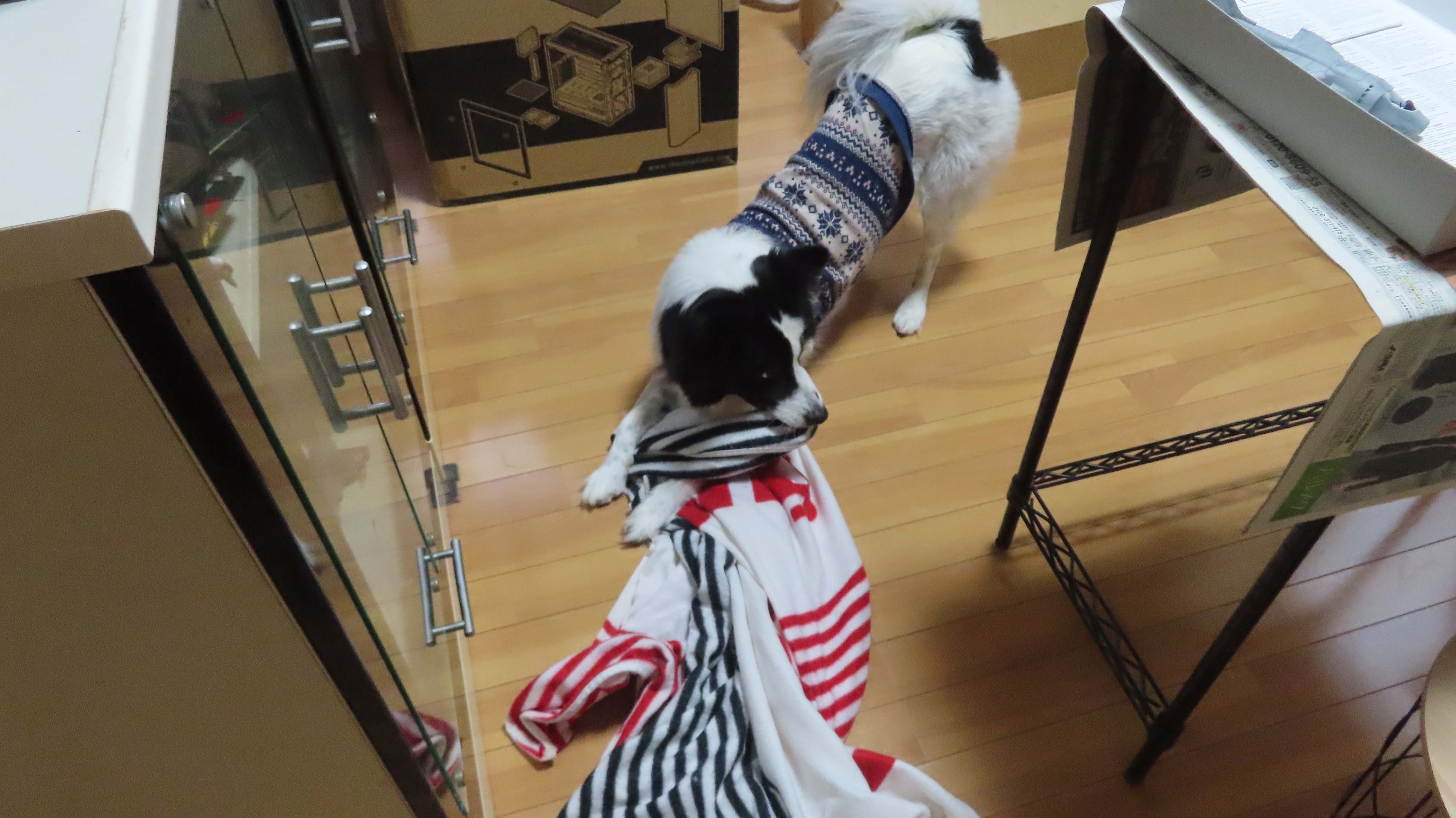 | グレーの塗り残しを筆で。 | 寒いのでマリーも毛布を 咥えて持ってきた。 |