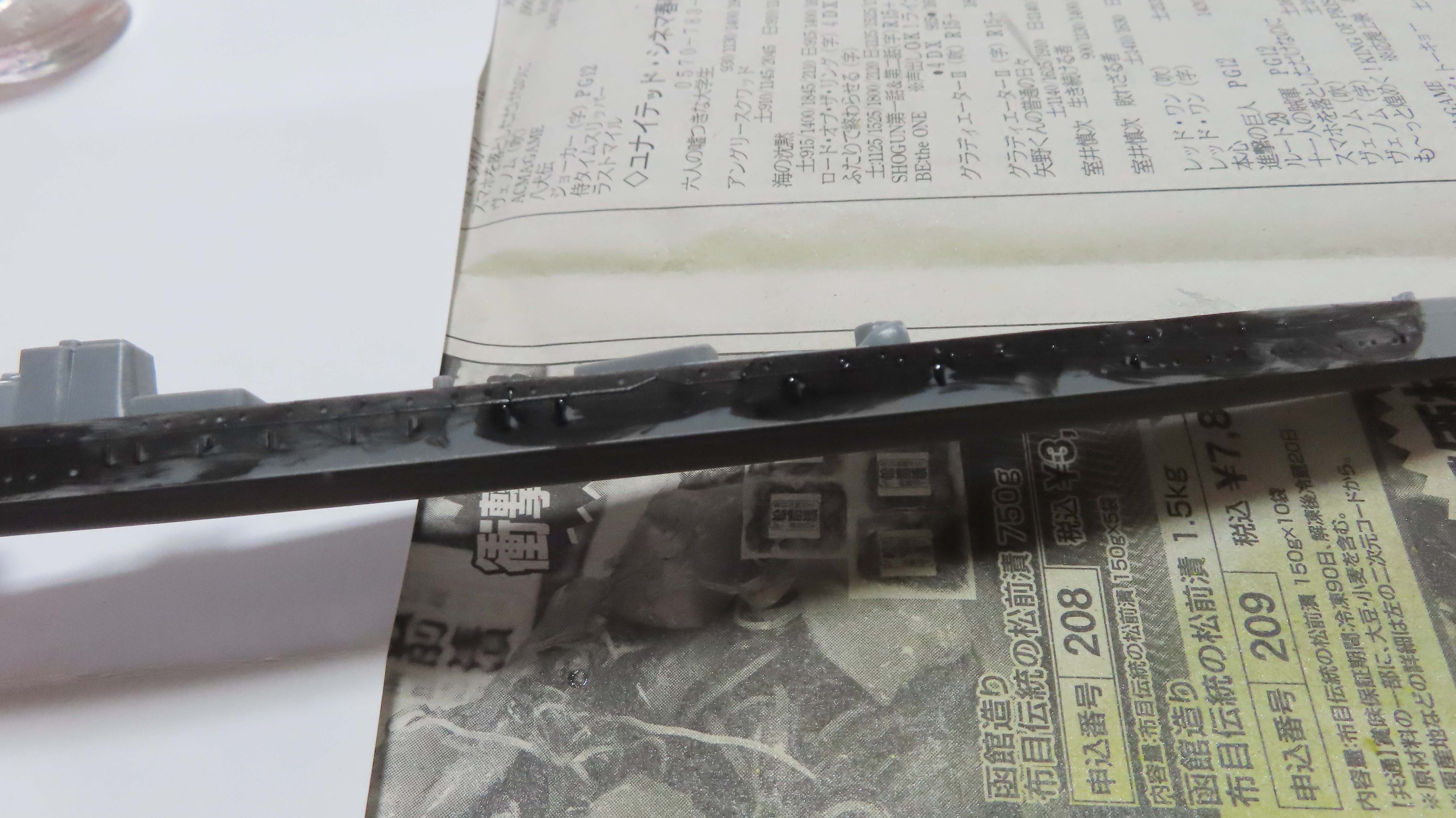 | 艦体側面を黒でスミ入れ。 その後ふき取る。 |