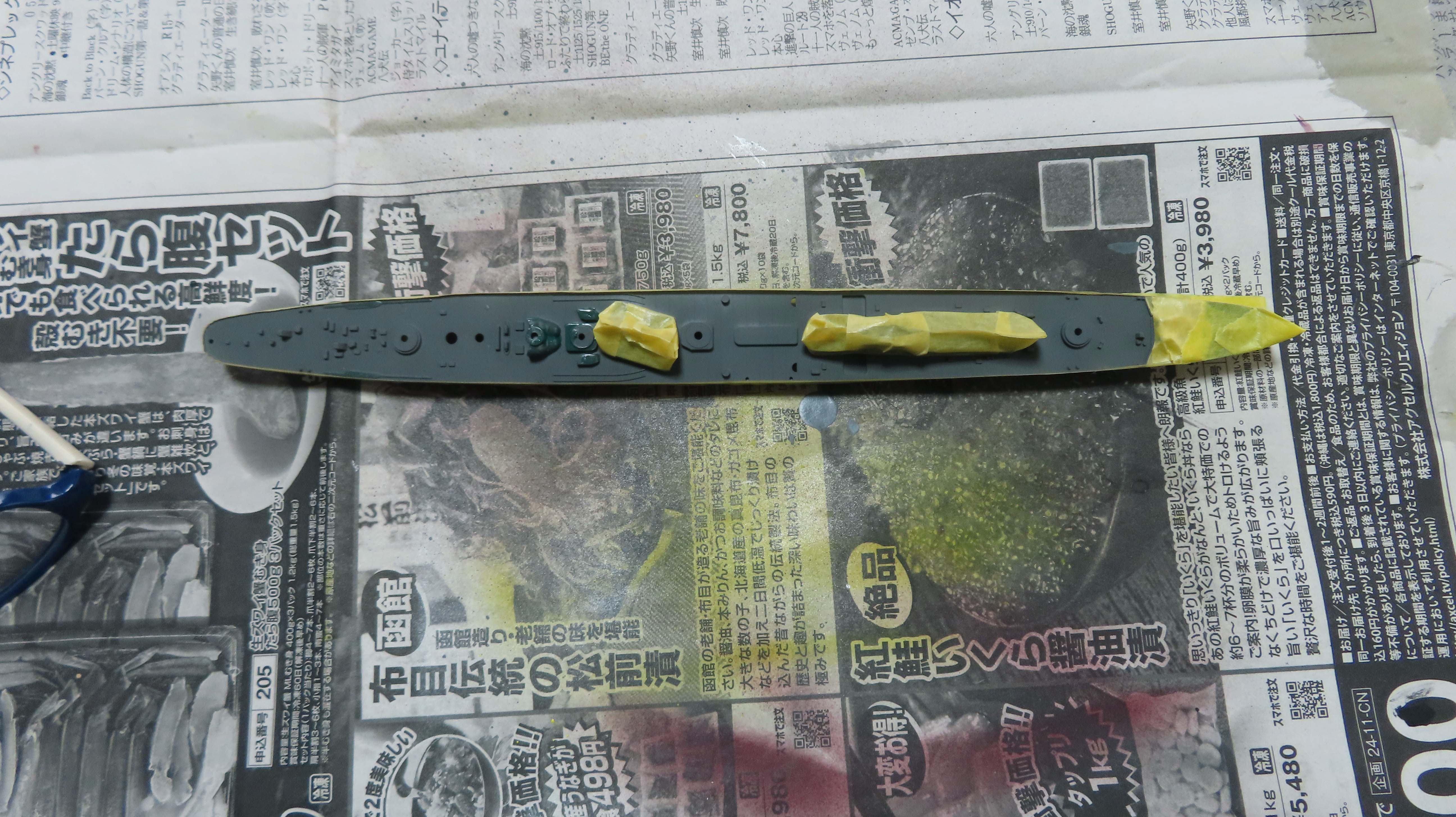 | 艦体をマスキング。 細かい突起は後から 塗りなおす方を選択した。 |