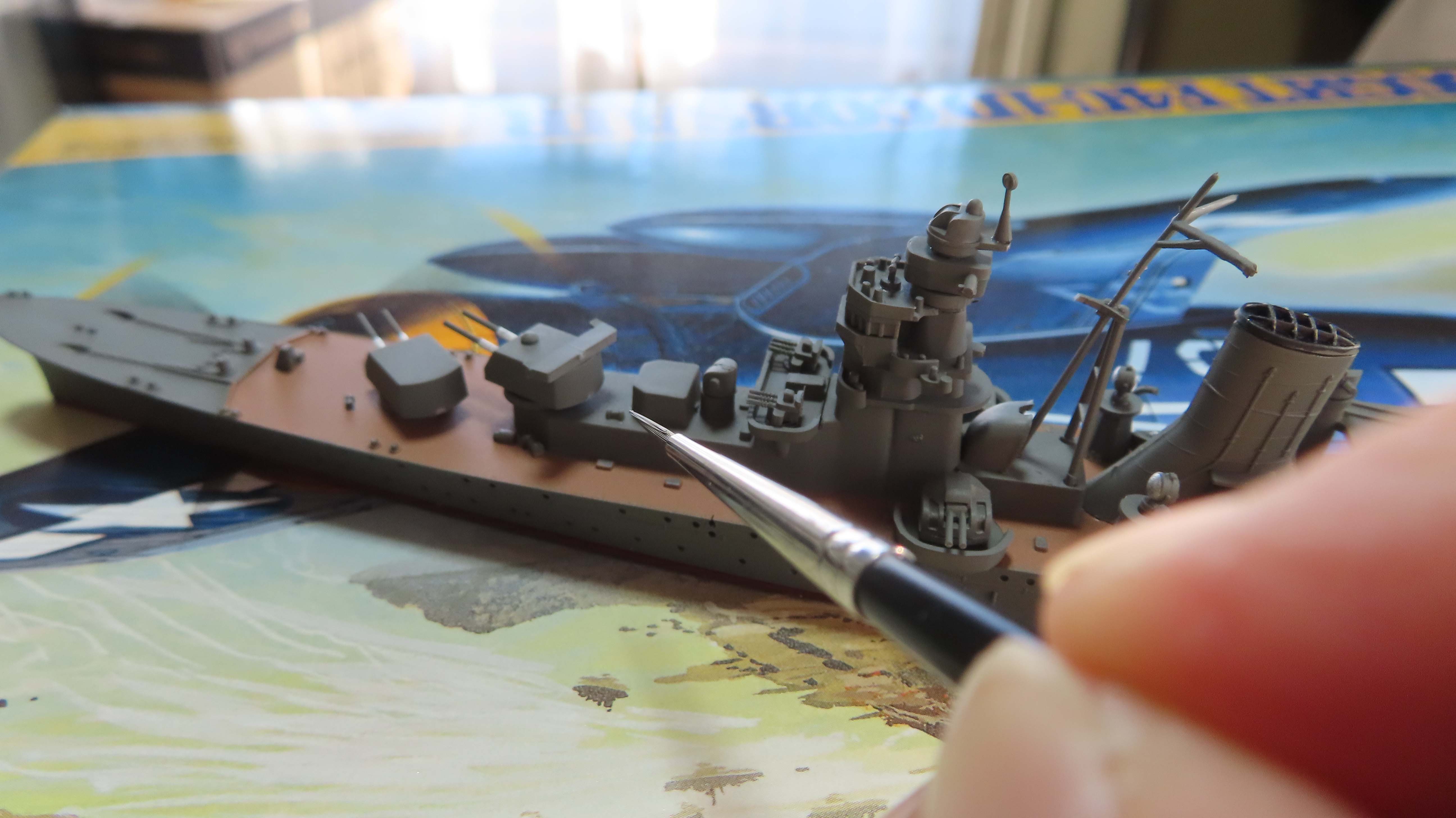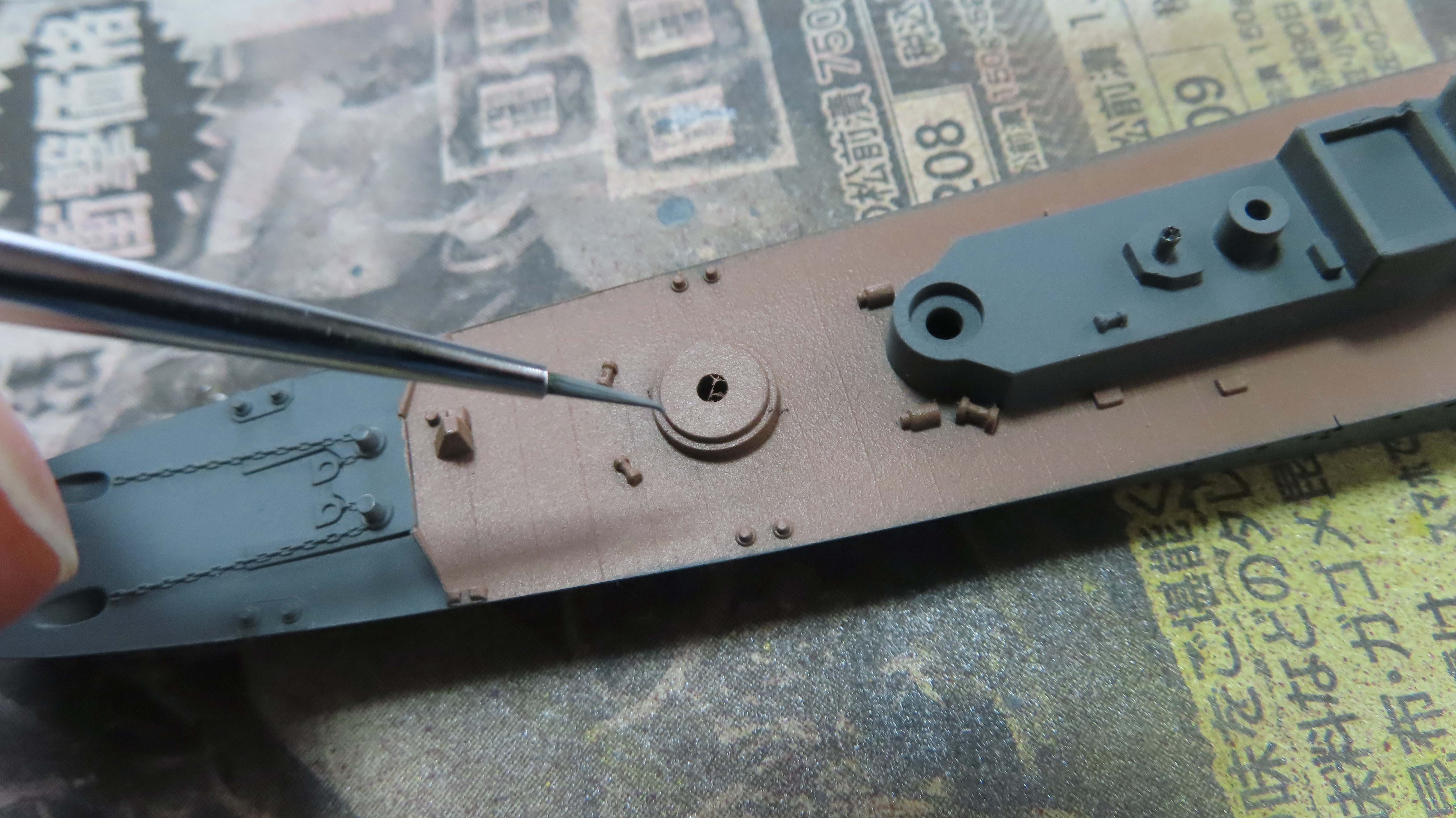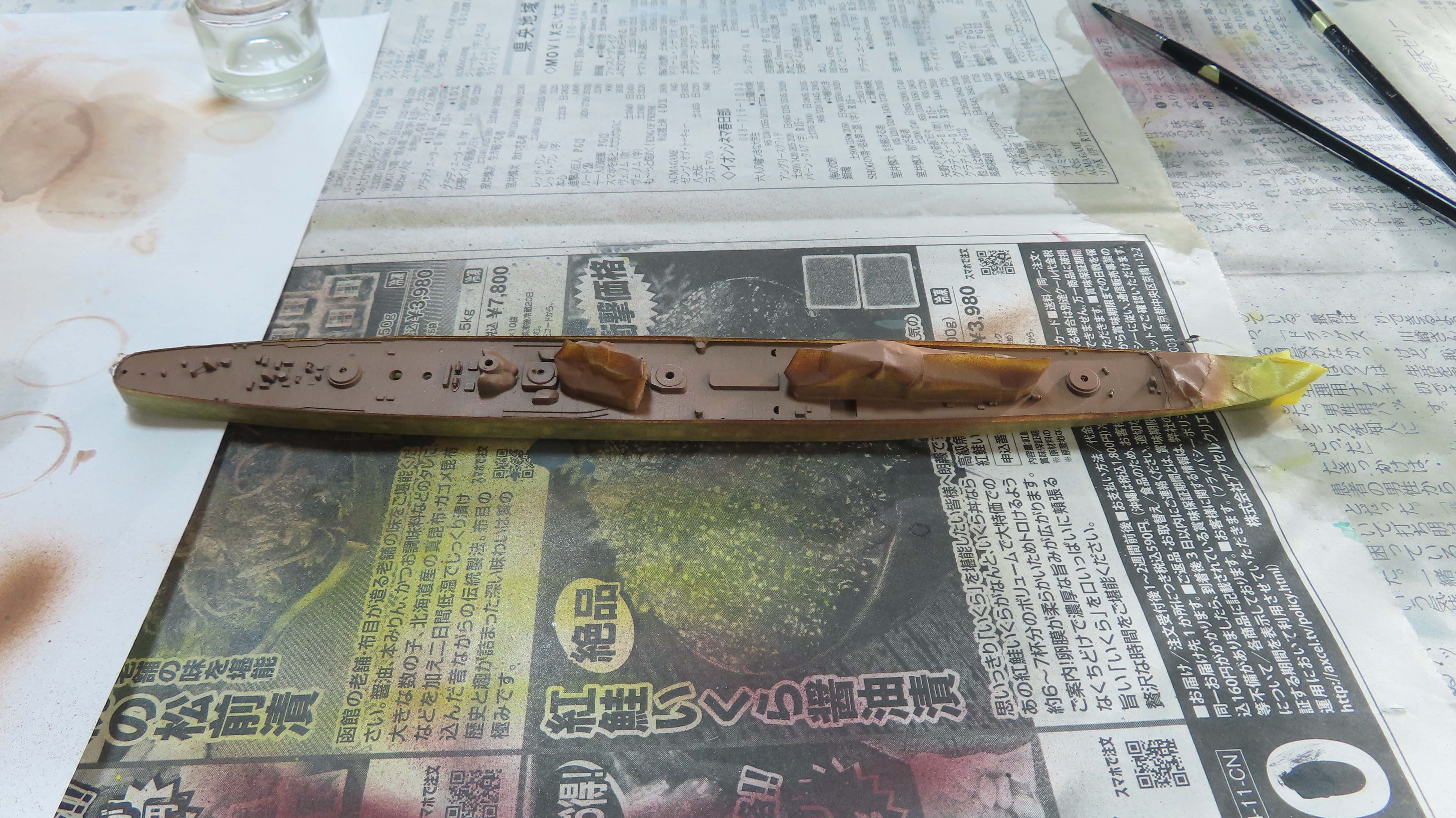 零水の上面色を塗装。 | ウッドブラウンをエアブラシ塗装 | マスク剥し後、軍艦色を塗りなおす。 |
