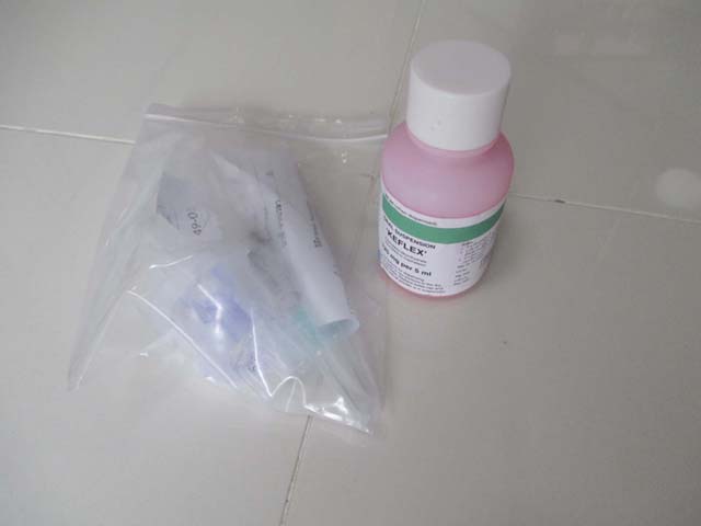 | 飲み薬を2種類もらった。錠剤はantihistamineとあるから、 抗アレルギー薬だろう。 錠剤の呑ませ方についてはこちらを参照 |