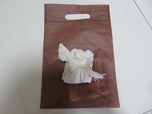 | 遺骨は燕尾色の袋に 入れてくれる。 ただ、隠ぺいしていないので 粉が落ちるため注意。 |