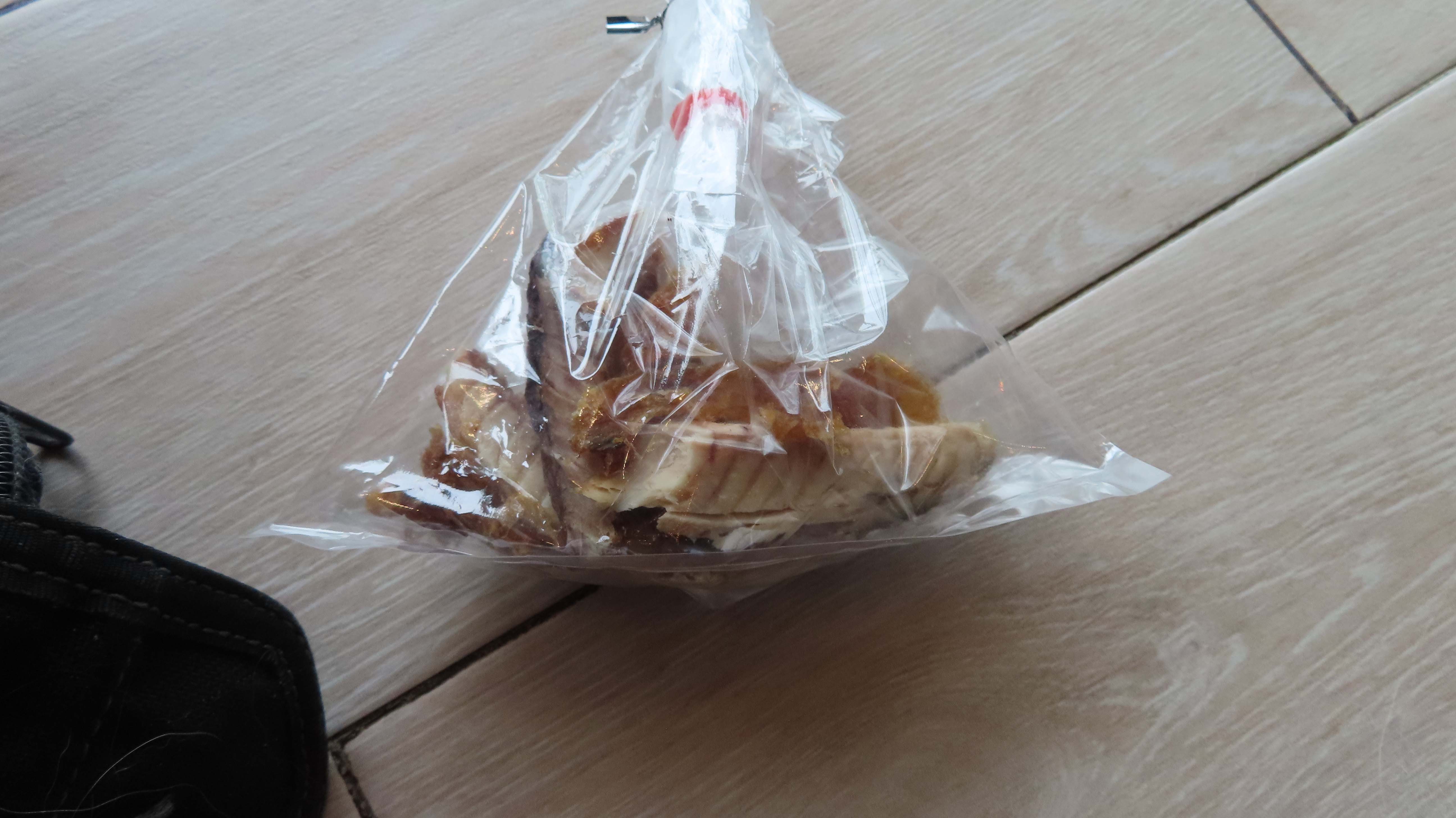 | 帰り、今回もマリーは鞄に入ろうとしないので、 時間はかかったが力づくで入れた。 妻が持たせてくれた餌もまったく無視された。 よく見ると、アジだかイワシの身まで入っている。 |