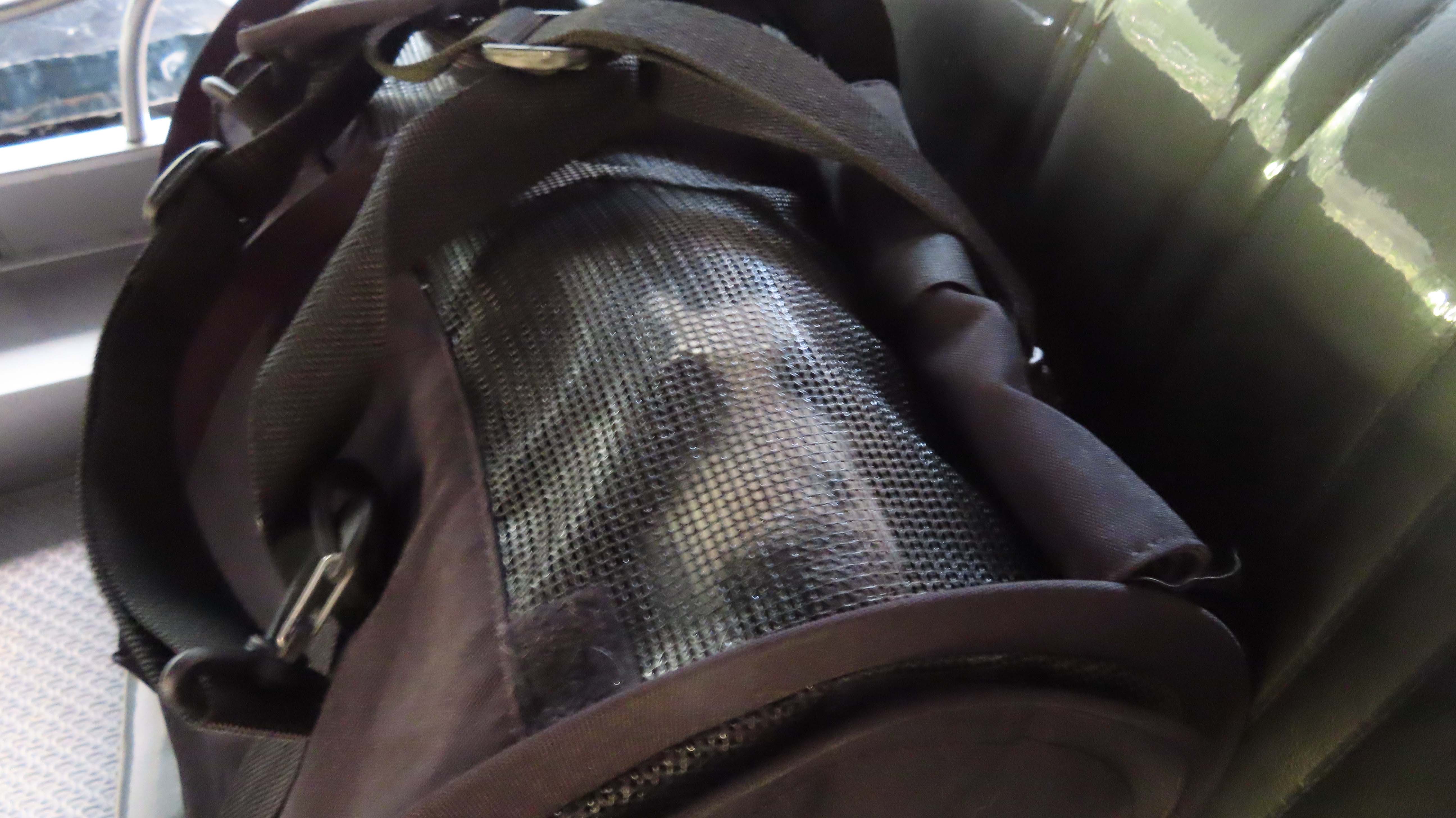 | 右の耳だ。皮膚がカサカサになっている。 | 今回は、マリーは自分からバッグに入った。 表情が楽しそうだ。 |