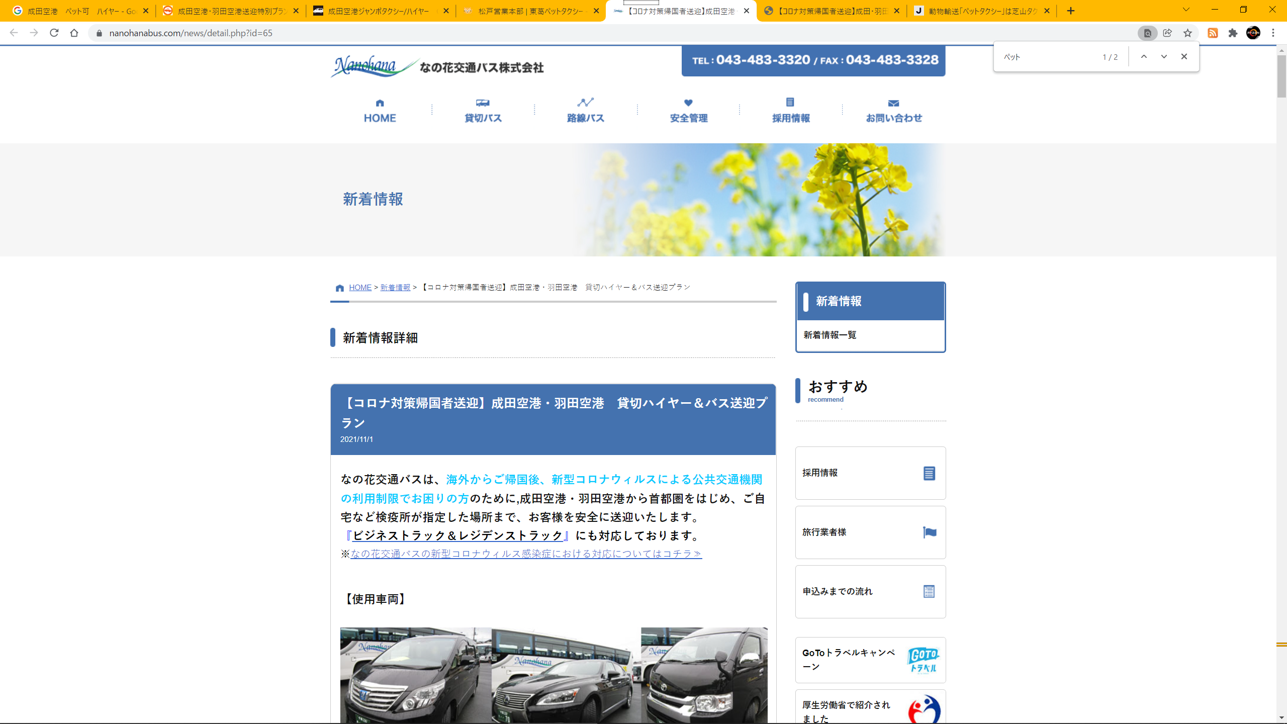 | というわけで「やこうDogはうす」はキャンセルして、 改めて調べなおしたところ、ケージにさえ入っていれば、 ペット可という業者は結構あって、順番に選んでいくと、ざっと5社はあった。 その中から土日祝は休業、などというわけのわからないところや、 あからさまに料金が高いところは除外して、 電話で問い合わせできるところを探した。 それが、上記「なの花交通バス株式会社」だ。 電話してみると感じのいい女性が出て、 料金は\45,000で、時間が読めないことはOKで、 待機施設から(厚労省から連絡があるはずだから) 情報を更新してくれれば問題ないとのこと。 なおこの待機施設だが、どこに送られるかわからず、 飛行機で関西に送られる人などもいるらしい。 そして、この電話で車は確保したので、後ででいいから 正式には同社webサイトのフォームから連絡してほしいとのことだった。 |
