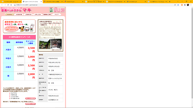 | それで、ここが今回見つけた「空港ペットホテル・マキ」。 インターネットで検索してトップに出てきた。 それによれば、 ・3日間の待機というのは、到着日は含まれないので、 料金は4日分とのこと (そのことはこの日は土曜で省庁は休みであるため、裏付けは取れなかった) ・料金は中型犬の場合、4日間で\12,000 送迎費込み やけに安いが、個人経営なので明朗会計なのだとのこと ・エサと散歩用のリード必須 エサは、引っ越し屋の話では、検疫しないと通過できないとのことだったが、 ここの業者の話では、未開封の固形フードは、ここの業者の利用者たちは 皆持ち込み可能だったとのこと。 ・1/6の雪の日に帰国した人などは、入国して空港を出るまで、 15時着の便で20時だったり23時だったりしたらしい。 ・ANAだとターミナル1の1Fに着くので、 @到着直後 A動物検疫に向かう前 に連絡が欲しいとのこと。 その後、南側リムジンバス乗り場のどこか、と指定してくれるとのこと。 そこまで恐らく空港職員の付き添いがあるだろうとのこと この業者さんも、規制がしょっちゅう変わりますからねぇ、と困った様子だった。 |