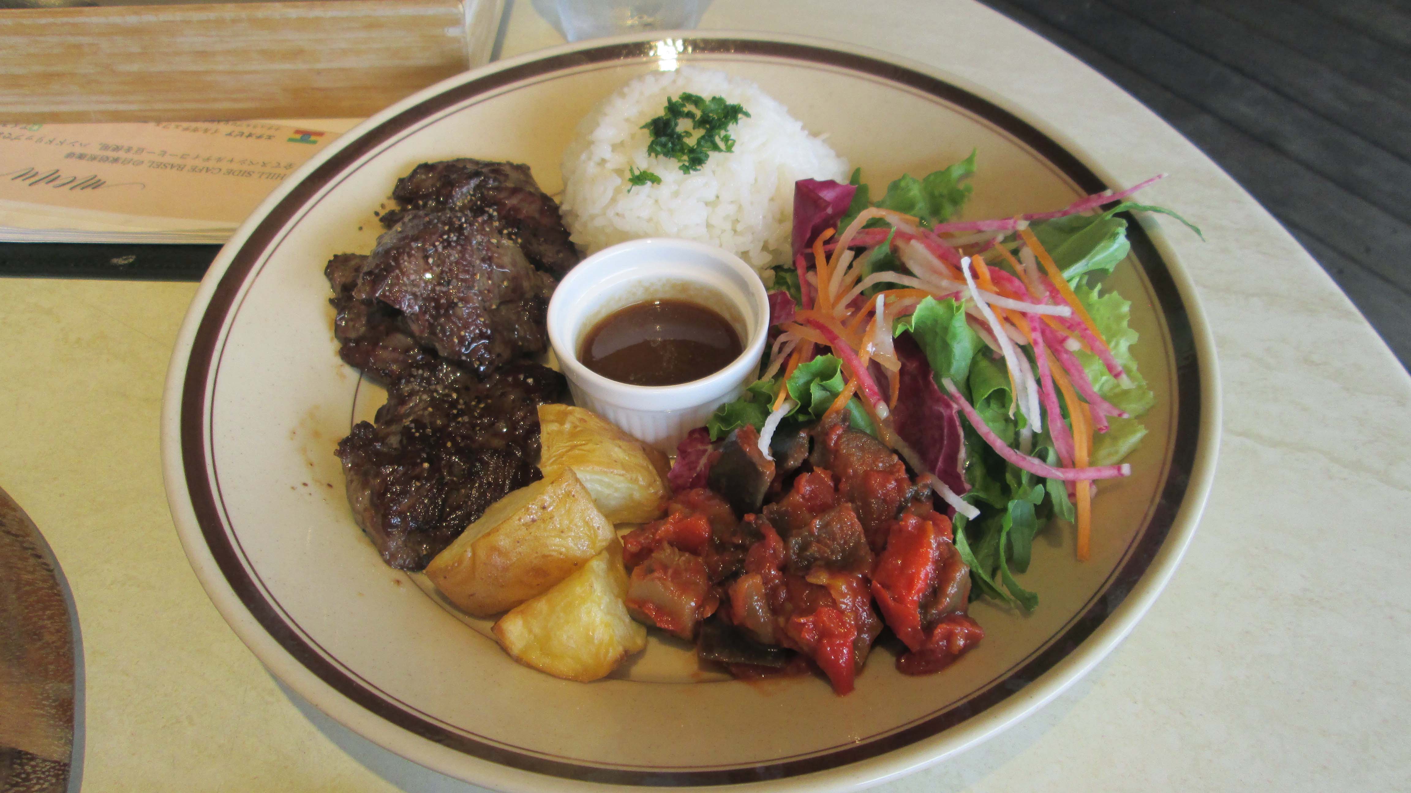 | 他に妻は赤ワイン \660、私はタンザニア・コーヒー \715をいただく。 結論、値段からして当たり前だが、全てうまかった。 ここはシェフは西洋人らしい。 動物が好きな人ならわかると思うが、 飼い犬と共に外でうまいものを食べることほど幸福なこともないと思った。 |
