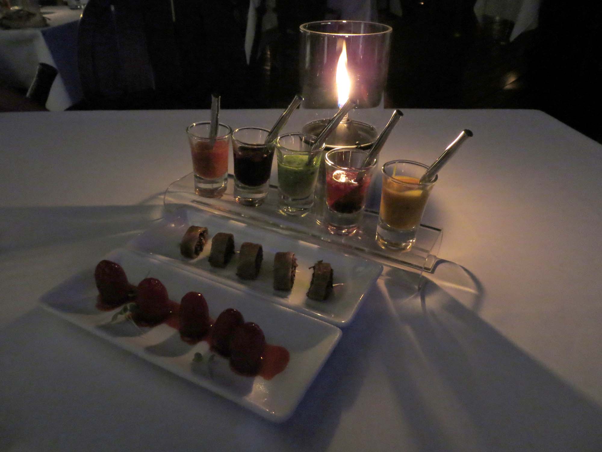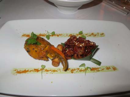 | お通し。食えたものじゃない。 | ロブスターのスープ | アラスカ蟹の爪の蜂蜜ソースがけ イカの唐揚げBBQソース |