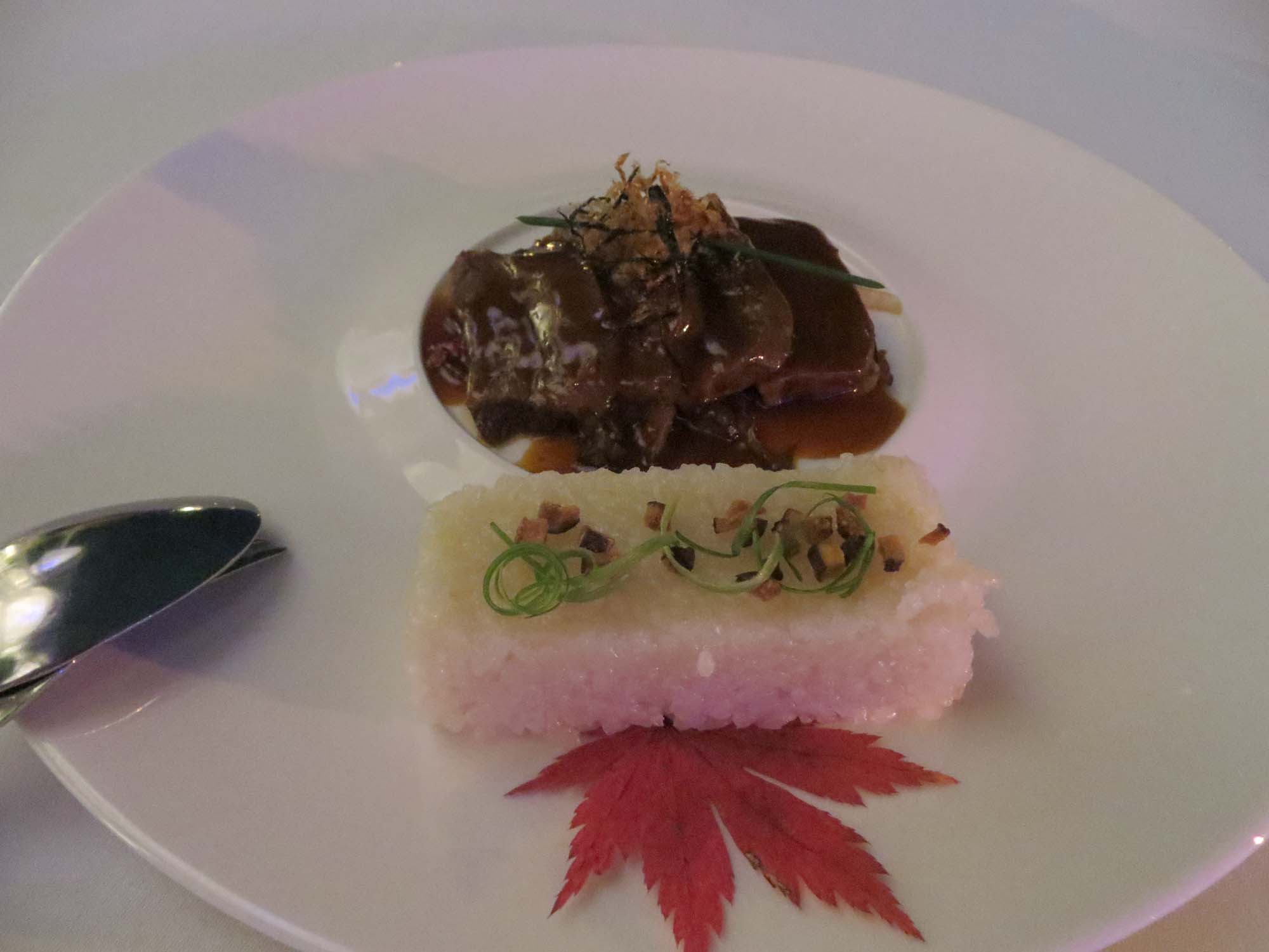 | 鶏肉の炭火焼き、海藻とチンゲン菜添え | オージービーフのステーキ、シチューソース そしてライスは日本米 |