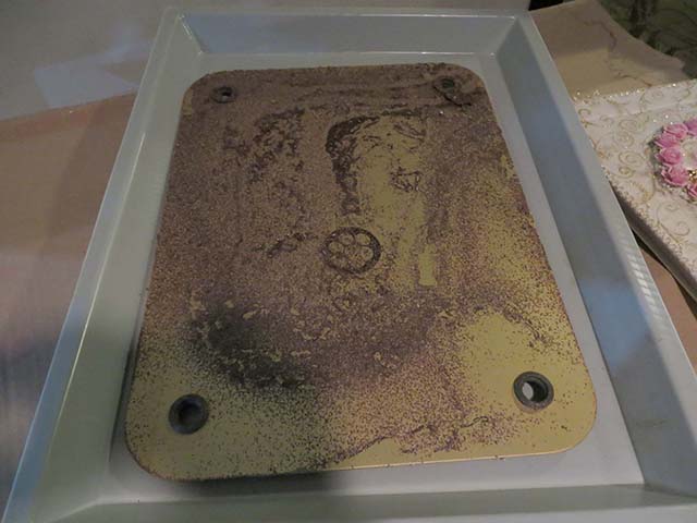 | これがメルのひんやりマット。 流石に金属なので齧られてはいないが、風呂場に持ち込んで スポンジを1個犠牲にして掃除した。 |