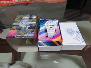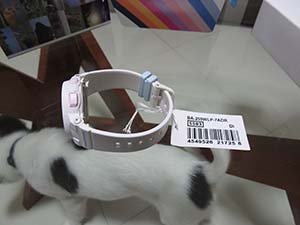 | これがBA-255WLP-7AJR。 割引価格THB 4,200。 化粧箱からしておしゃれ。 このカラフル感に魅了されて買ってしまった。 そう、妻の誕生日プレゼントにすればいいのだ。 こんなきれいな時計をもらって、いらないと言う人はいないだろう。 |