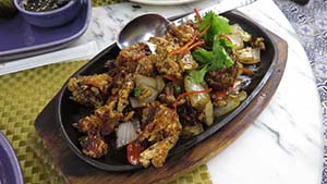 そこで、naraにやってきた。 写真左はなんだかわからない、謎のスープで、 蟹が入っており辛くない。THB 380。 右はプーニム・パット・プリク・タイダム。THB 460。 プー・トート・パット・プリク・タイダムが販売終了とのことで、 プーニム(ソフトシェルクラブ)では作れないか? と聞いて、出してもらったのだ。 |