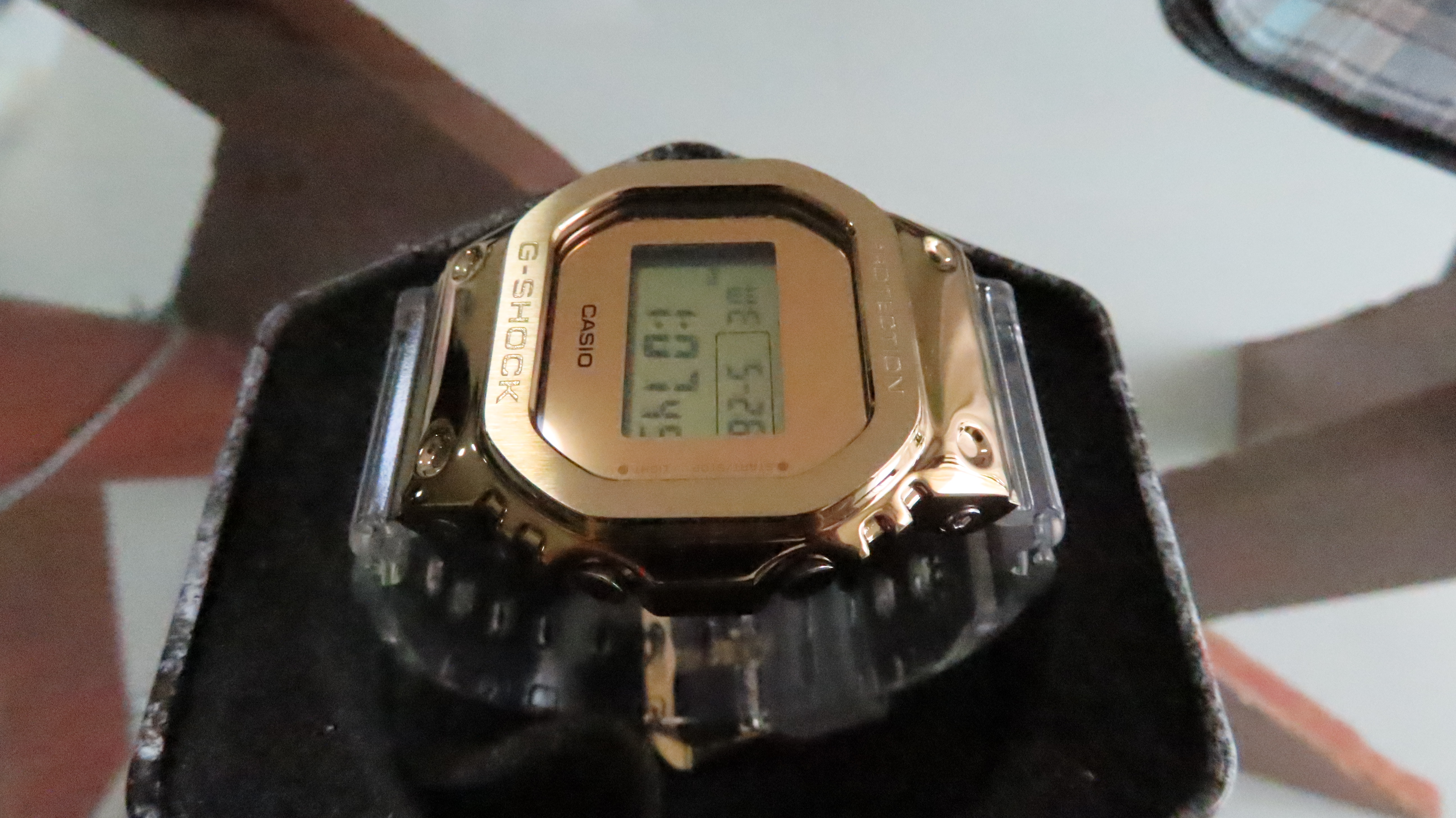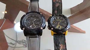 | 尾錠はステンレス。 | 妻のGA-700MMCを並べる。 そっちを景品用に回すか、 と訊くといやだとのこと。 結婚記念日にもっらたやつ じゃなかった?というので、 それはGA-400だと教えた。 |