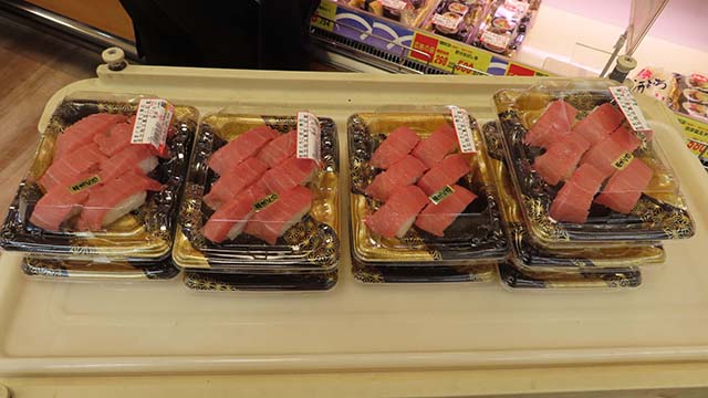 | ・・・て、寿司を選んでいる間に、本マグロのにぎりが登場。 むむむ、にくいなあ、三和! しかし、悩んだ末変更はしなかった。 |