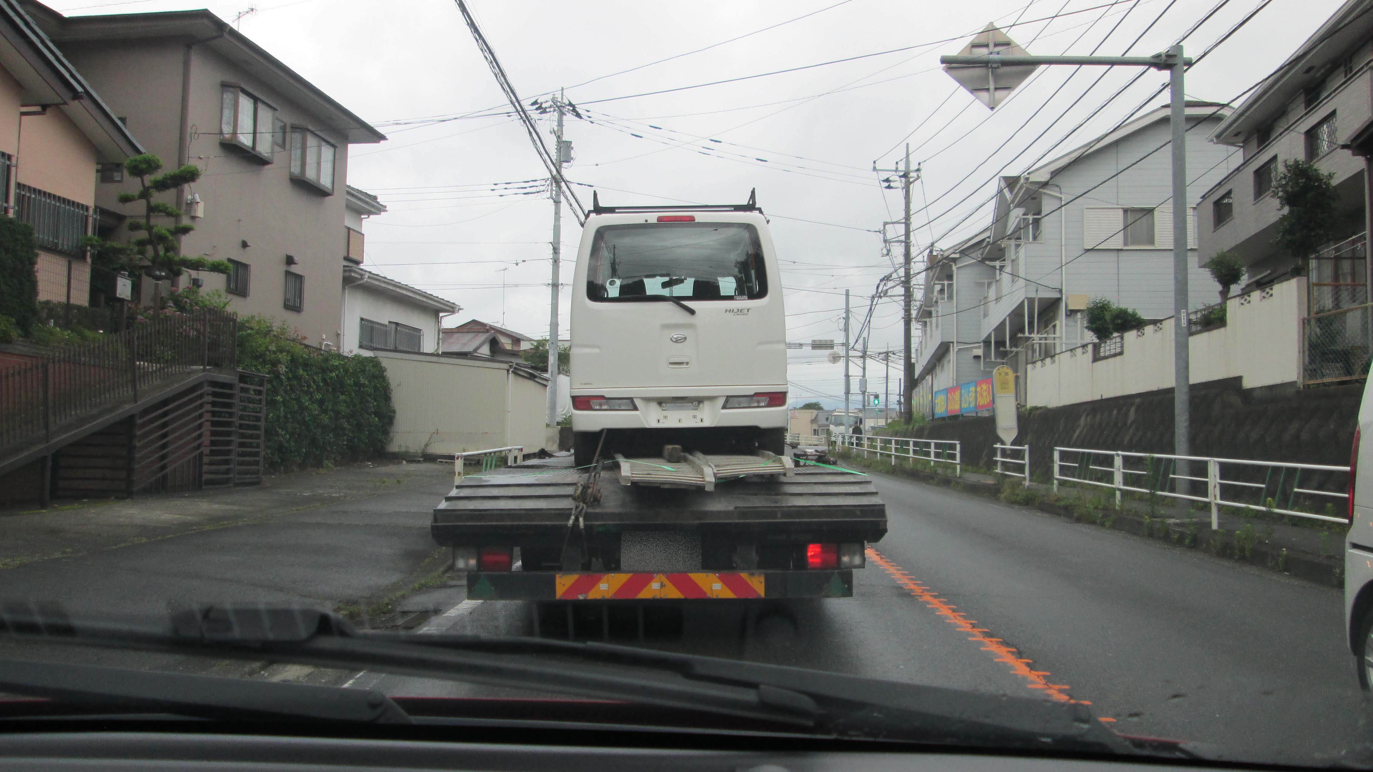 | 今日も今日とて雨。先週晴れた他は、土曜はひと月雨続きである。 前の車が落っこちてきそうで心配だ。 |