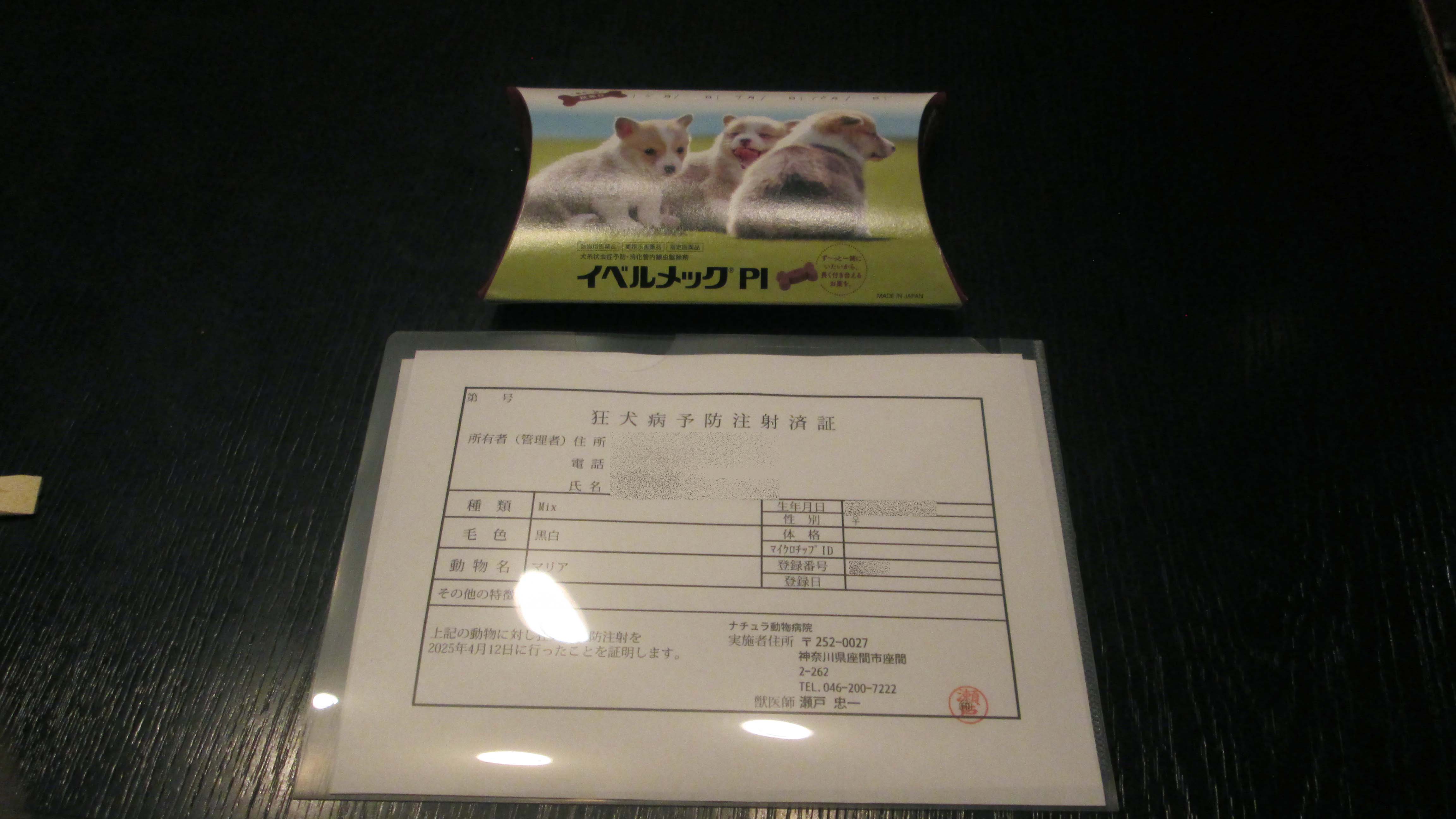 | 動物病院ではイベルメックを3個と、 先週頼んでおいた狂犬病の接種証明をもらう。 こちらは無料だった。ありがたい。 イベルメックの料金は\6,435。 ブラベクトは、暮れに与え忘れたので1個余っていた。 |