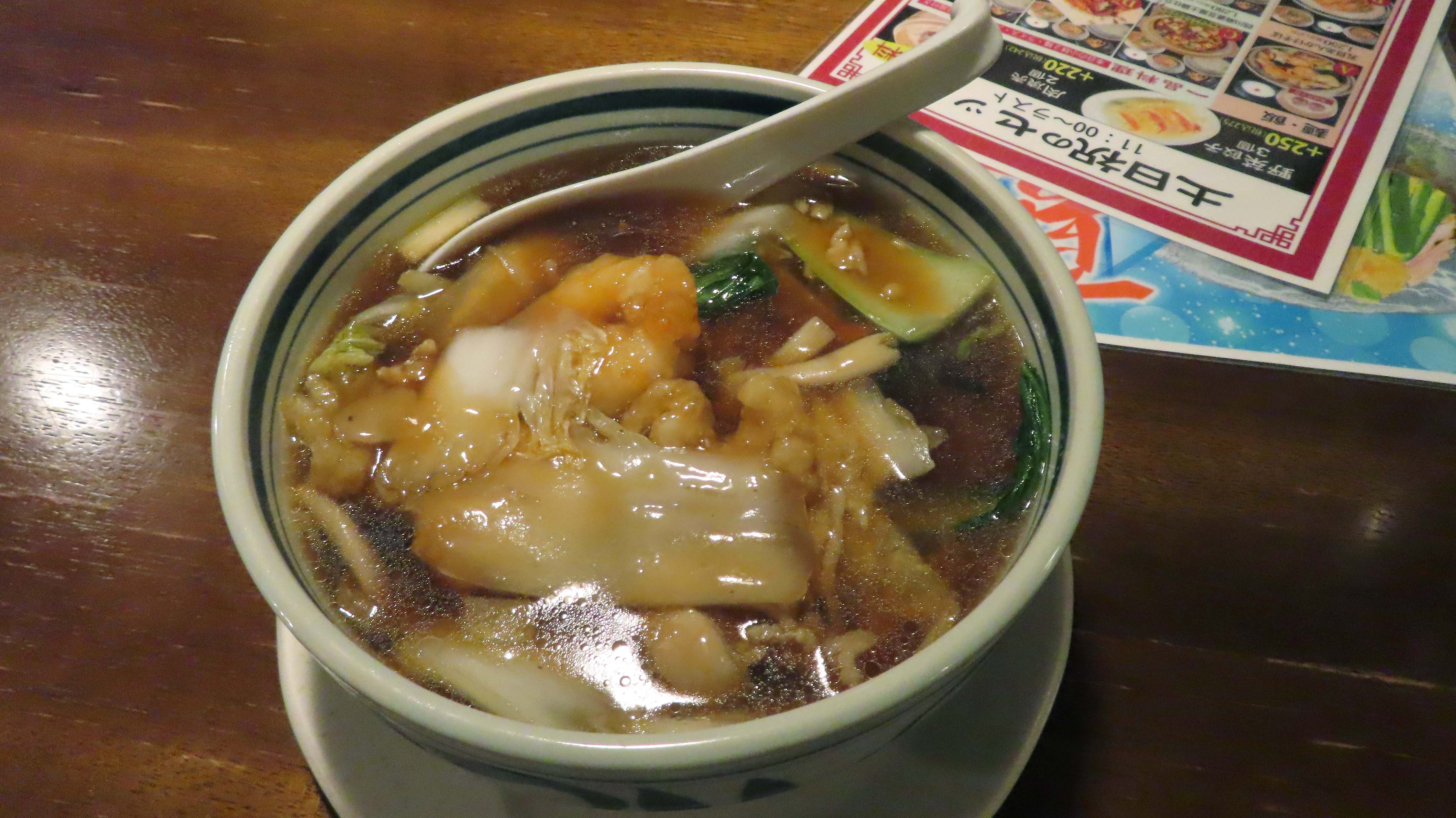 | この辺も普段より人出は多い方だ。 | 目指す北京飯店出現 | この内装が気に入っている | 五目あんかけそば \1,188 脂っこいが味は 濃すぎず気に入っている |