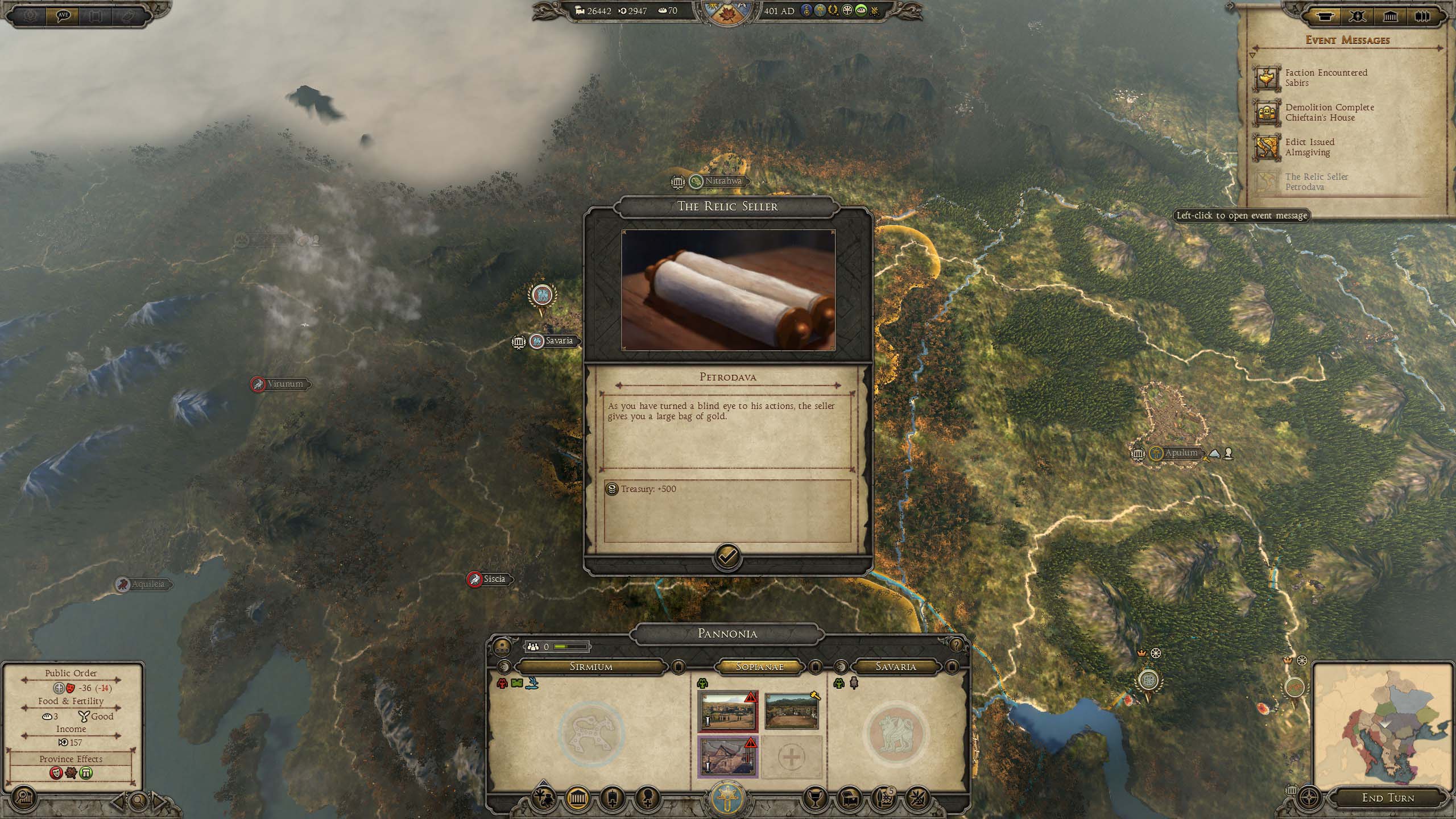 | 研究開発。矛兵の強化を選択。 | 占領したパンノニアの都市に 総督を置く |