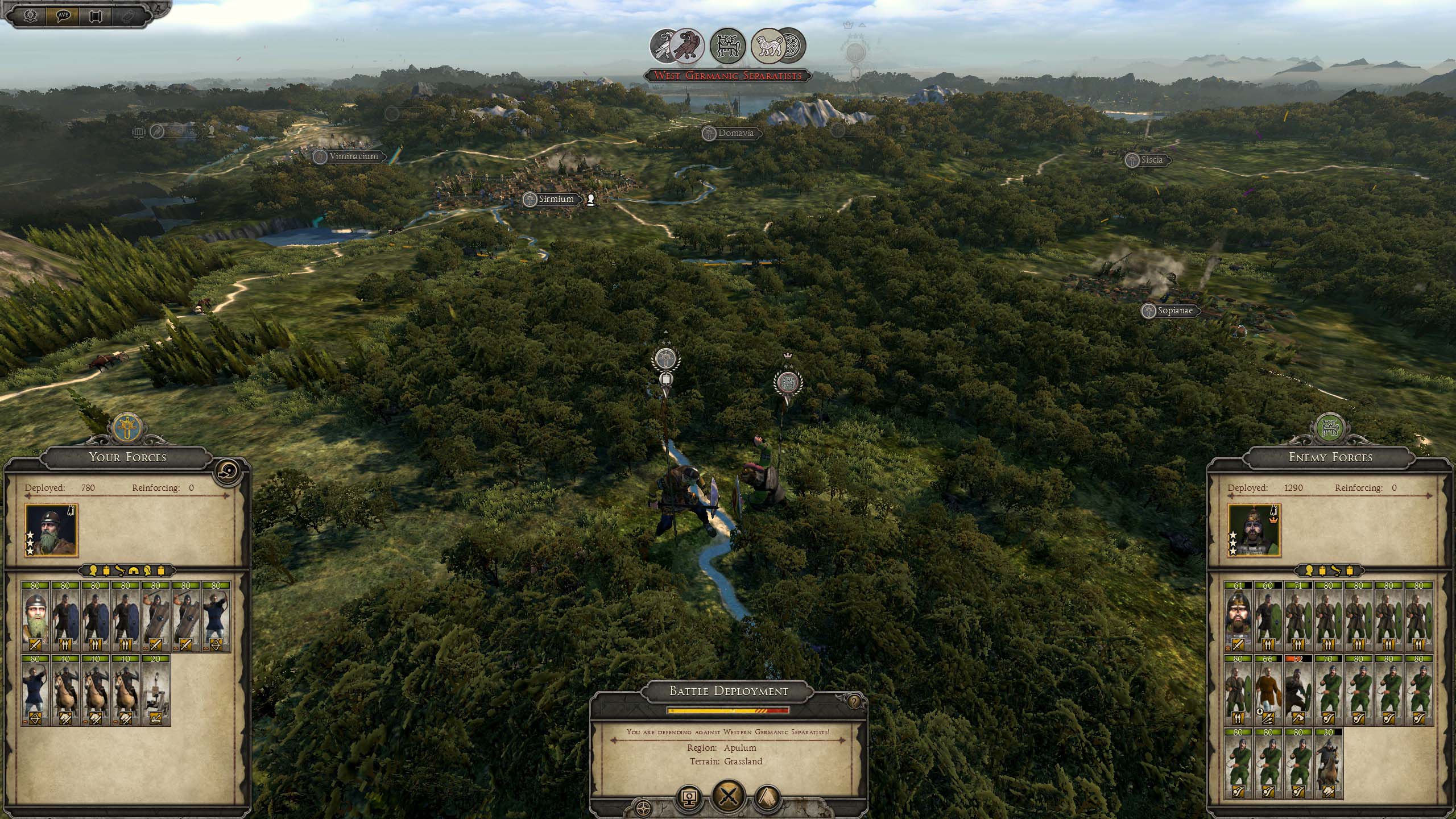 | 西ゲルマンと対戦。 | ちょいと敵の指揮官ユニットを 甘く見ていて中騎兵が1部隊 退場したのだが、 |