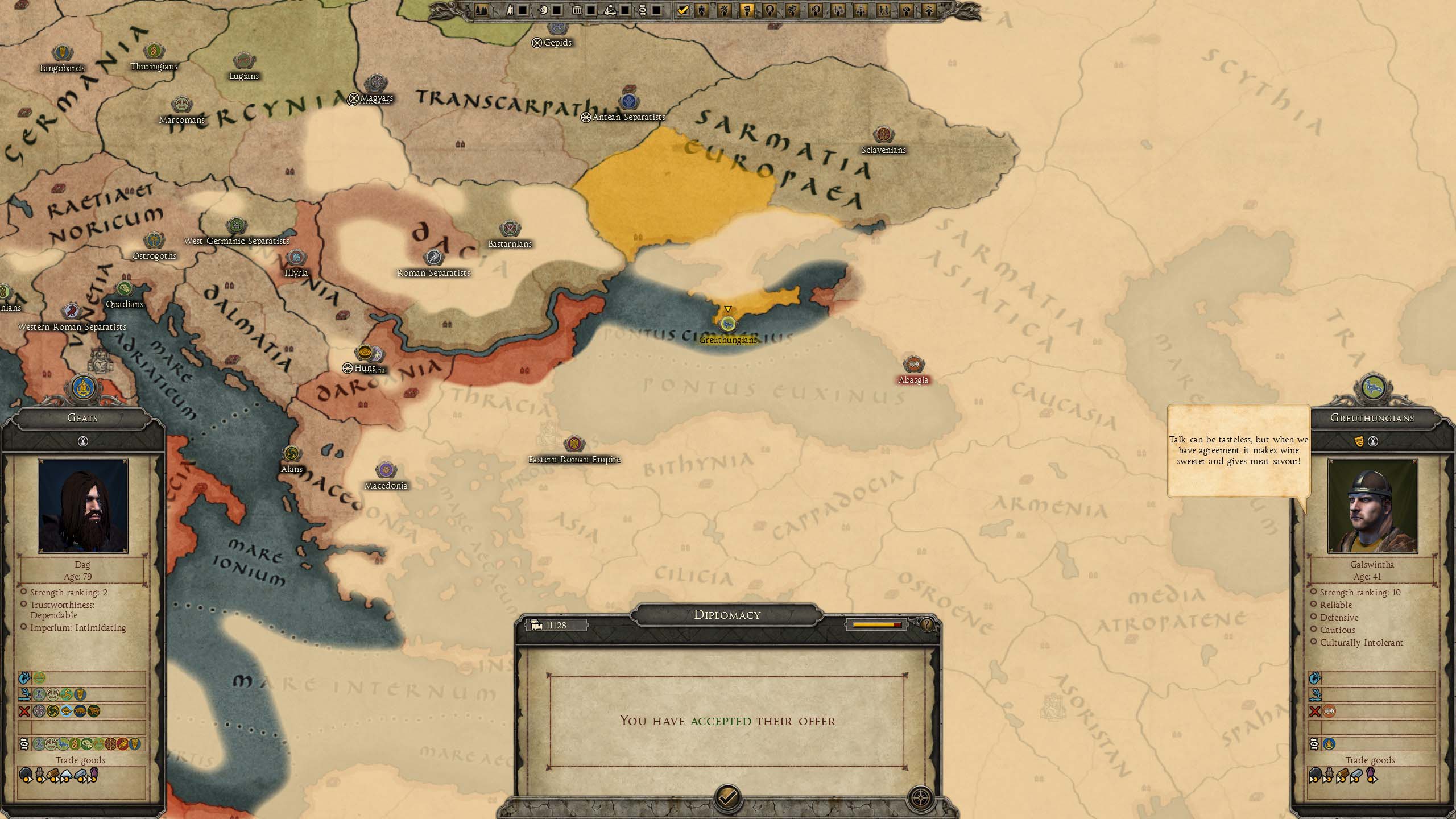 | Greuthungianと交易 | 先方が要求増ししてきたが、 | 呑んだ。 | |