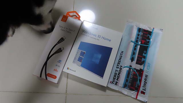 | W10のOSは例によってUSBドライブ形式で、THB 4,290。 TYPE-C <-> TYPE-CケーブルはTHB 190。 Kingstonのマスクは無料で置いてあった。 もっと持ってくることもできたのだが、中国人だと思われたくないのでやめた。 |