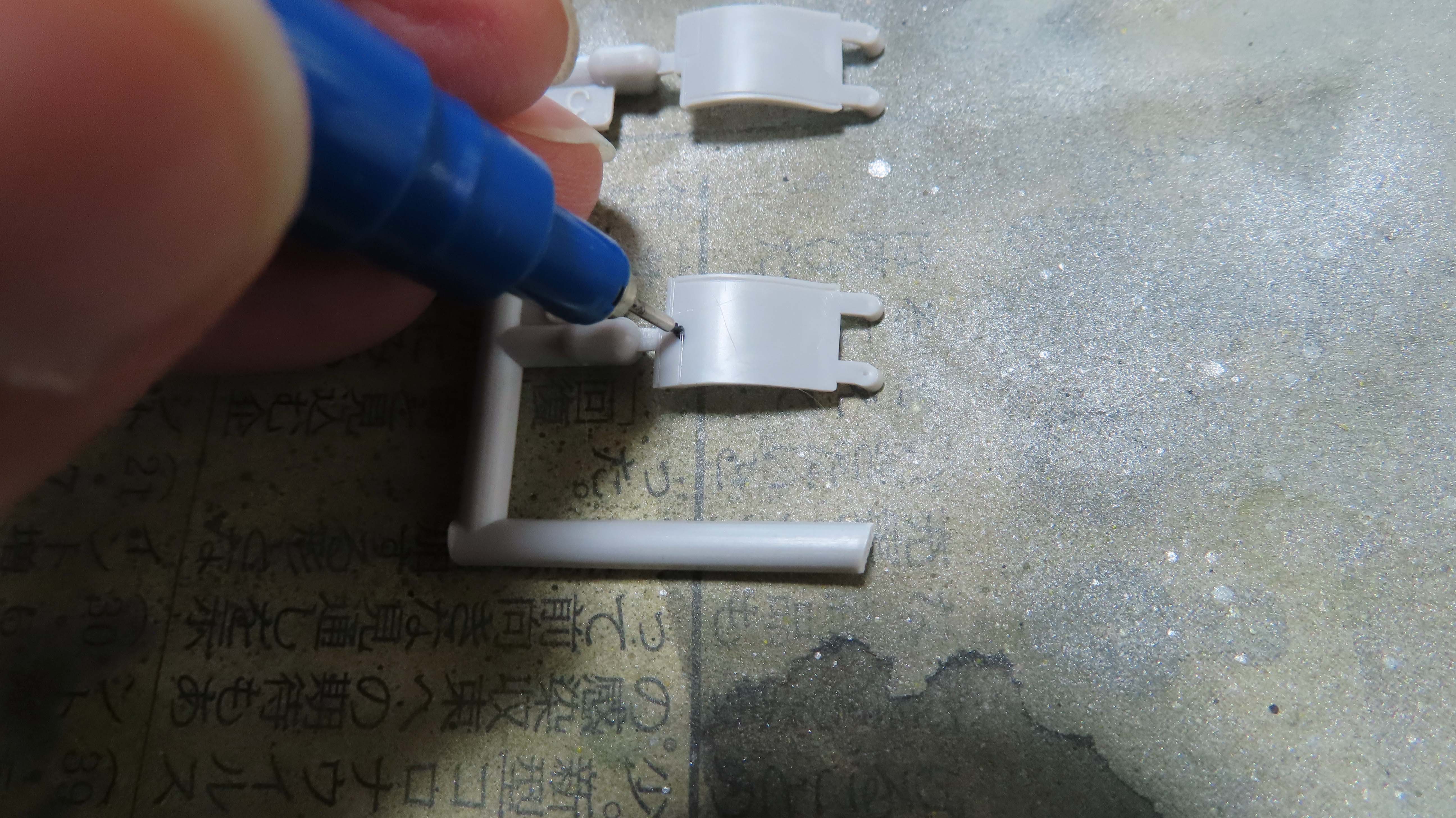 主脚収納部のパーツは ダボが短くて固定できなかった。 それでどうしたかというと、 マスキングテープを丸めて詰めた。 |