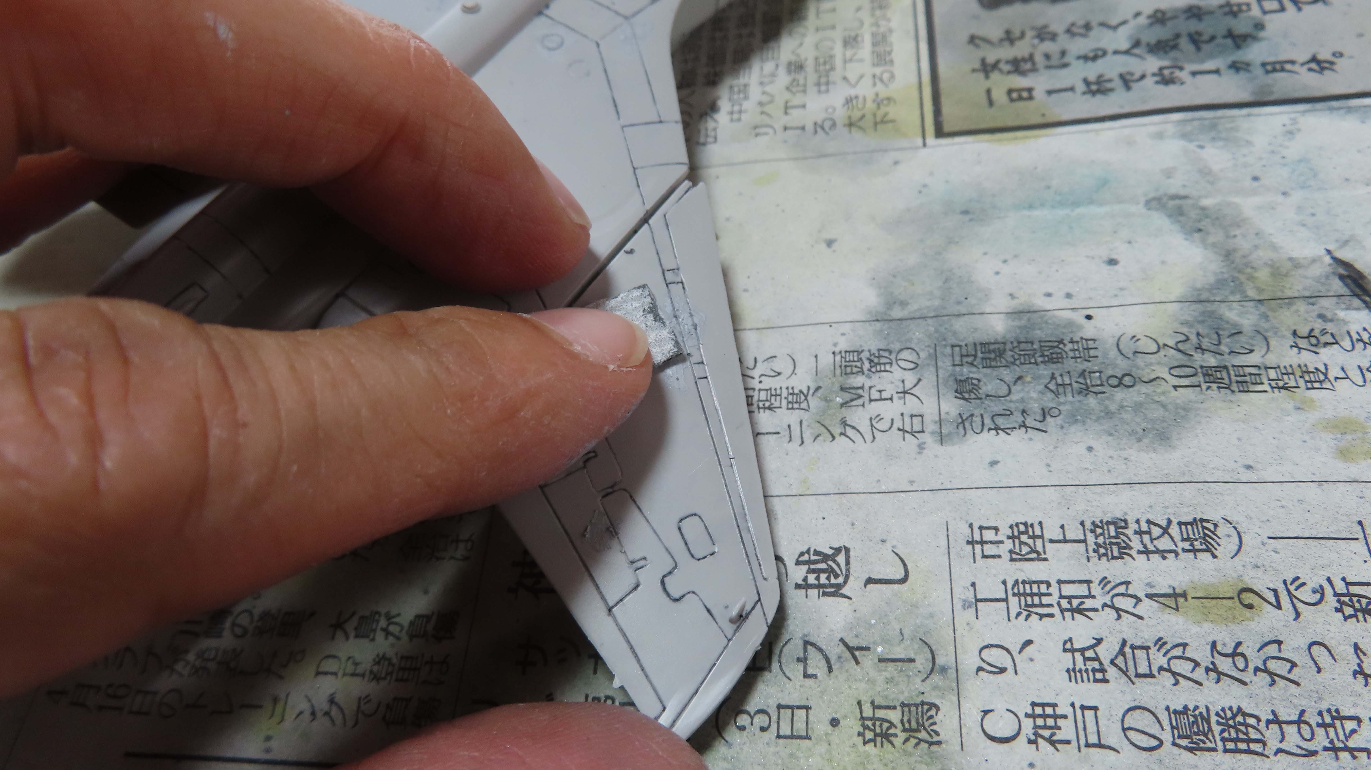スジ彫りのケガキ。 丸いものはケガけないことに気づく。 向きを変えないといけないが、 塗装を考えるとランナーから 切り離せないのだ。 |