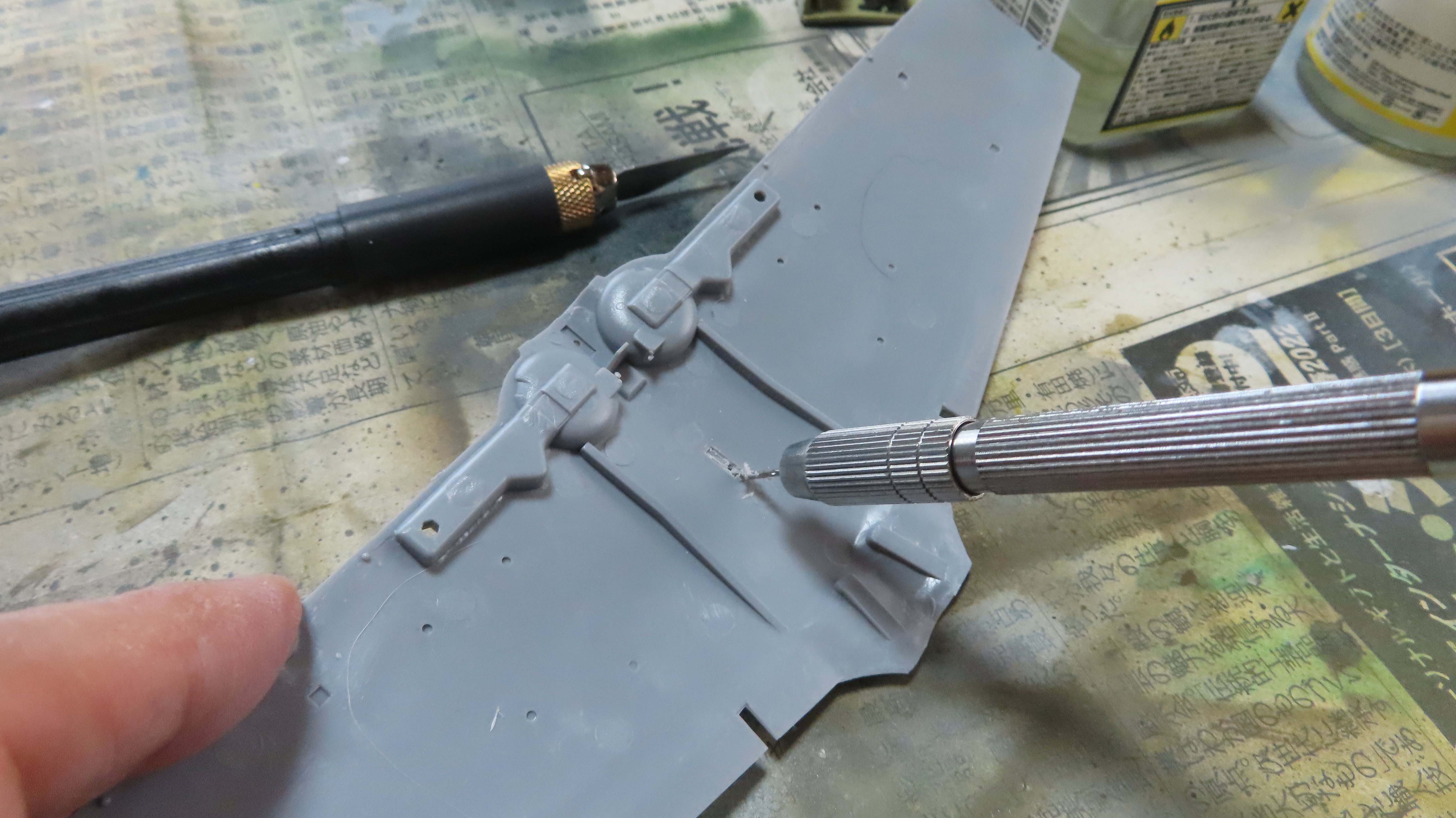 キャノピーのマスキング | コクピットの組み込み | 機体下面に穴をあけるのだが、 板厚が厚く、カッターでは らちがあかない。 |