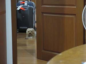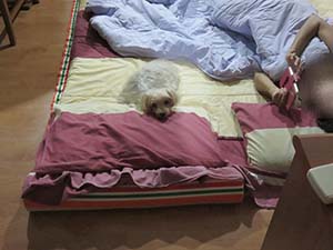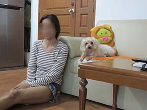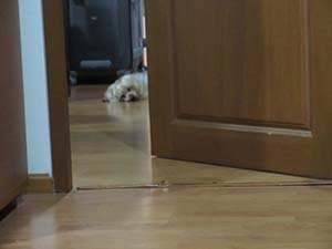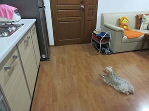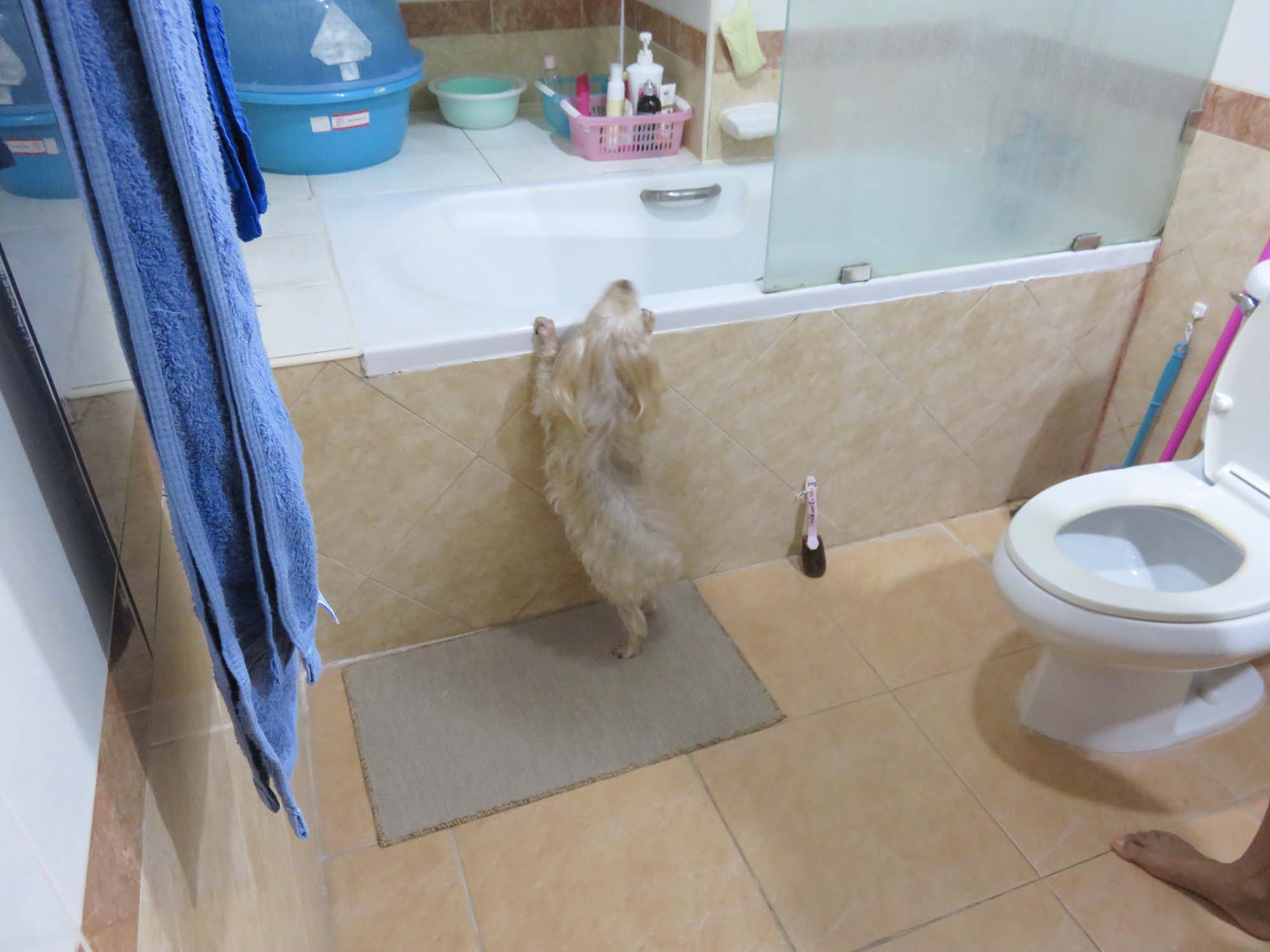 | ウチの娘はなぜかエサの前に 小便をする習性があり、 妻がしつけて風呂場に来るようにした。 |