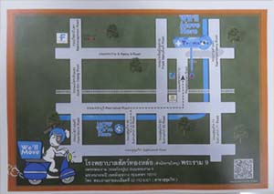 | 2016年12月5日、THONGLOR PET HOSPITALが移転した。 左上はwebsiteに掲載のMAPだが、良く分からないので右上に googlemapからの抜粋を掲載した。係員たちはラマ9、ラマ9と 言っているが、実のところラマ9ではなく、その手前だ。ところで実際に タクシーで行ってみると、元の場所からそう離れてはいない。 |