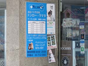 ここが元の病院。閉まっている。 | 向かいがペットショップに なっていたのだが、一部スペースを 割いて診察所になっている。 もちろん、フードを始めグッズも 少しある。 |