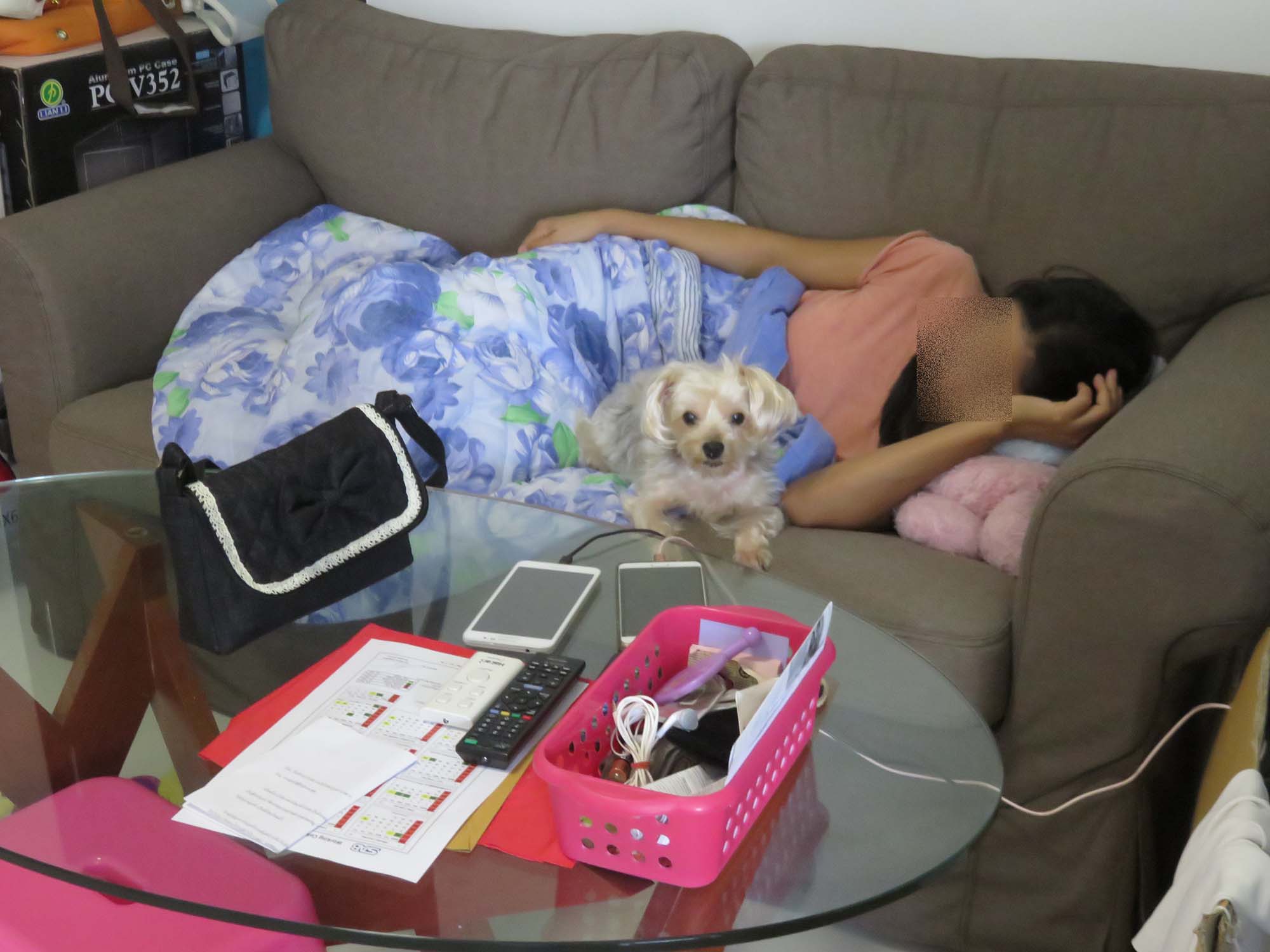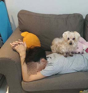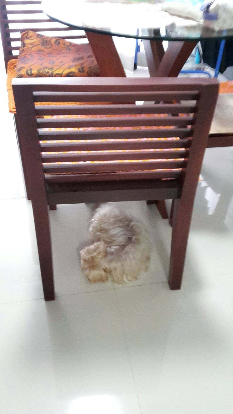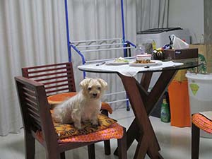 | 服のフード | TVの下 | 飼い主の帰宅を待つメラニー | 妻の料理を見守る。 |