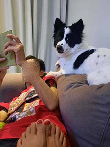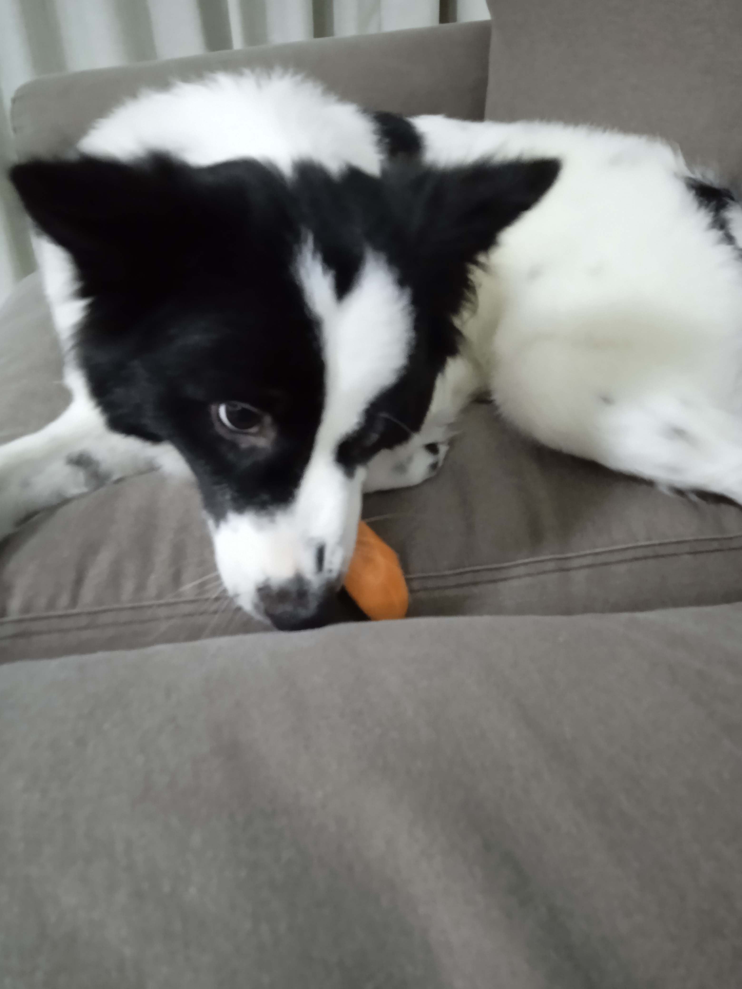 | ある日、妻が不在の日に家に帰ってみると、 マリーはどこかからか人参を咥えてきて食べていた。 妻がやったのをおもちゃにしていたのだろう。 |