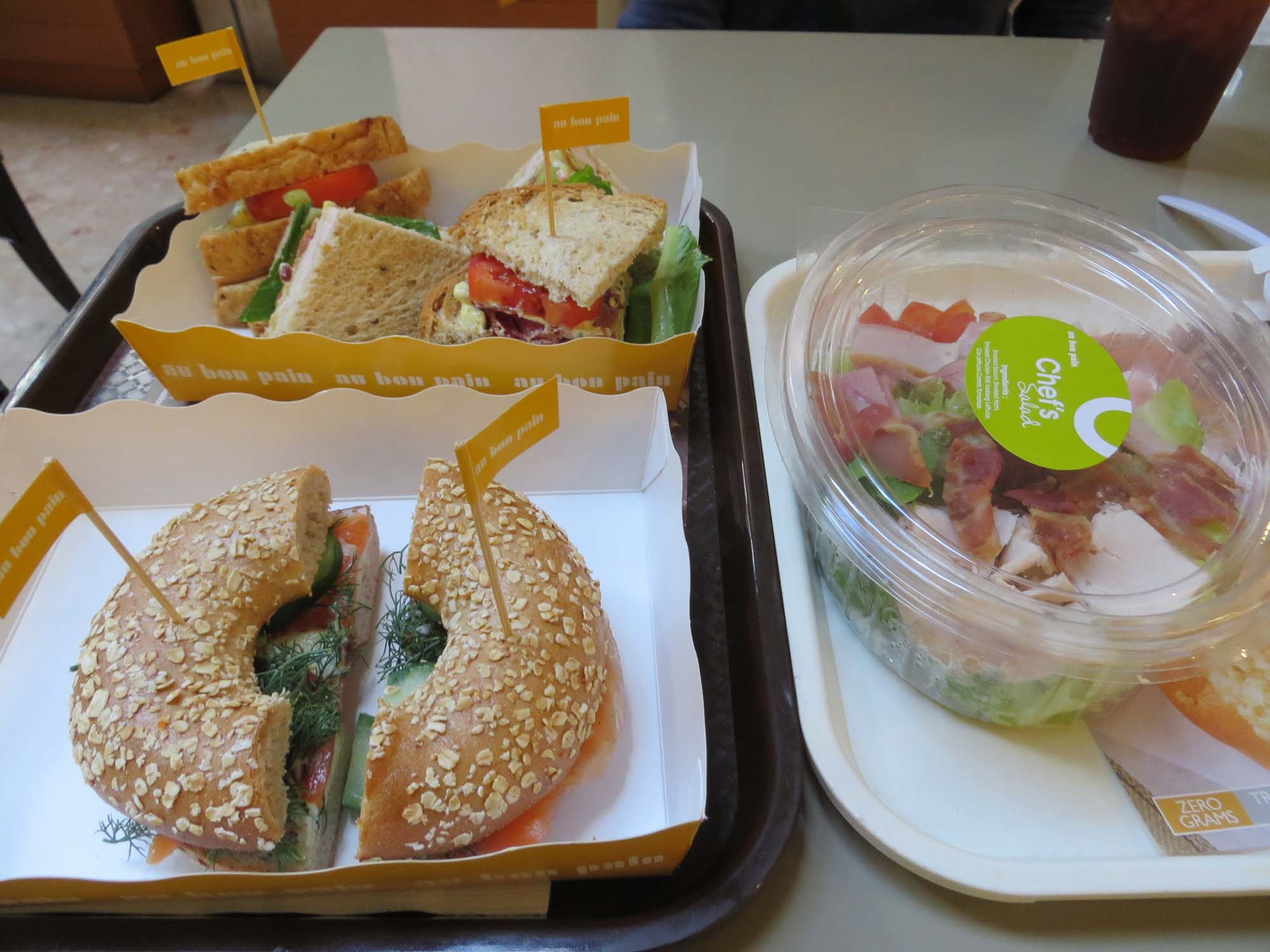 左奥:クラブ・サンドイッチ 195THB 左手前: わさびサーモン・ベーグル 175THB 右サラダ 115THB |