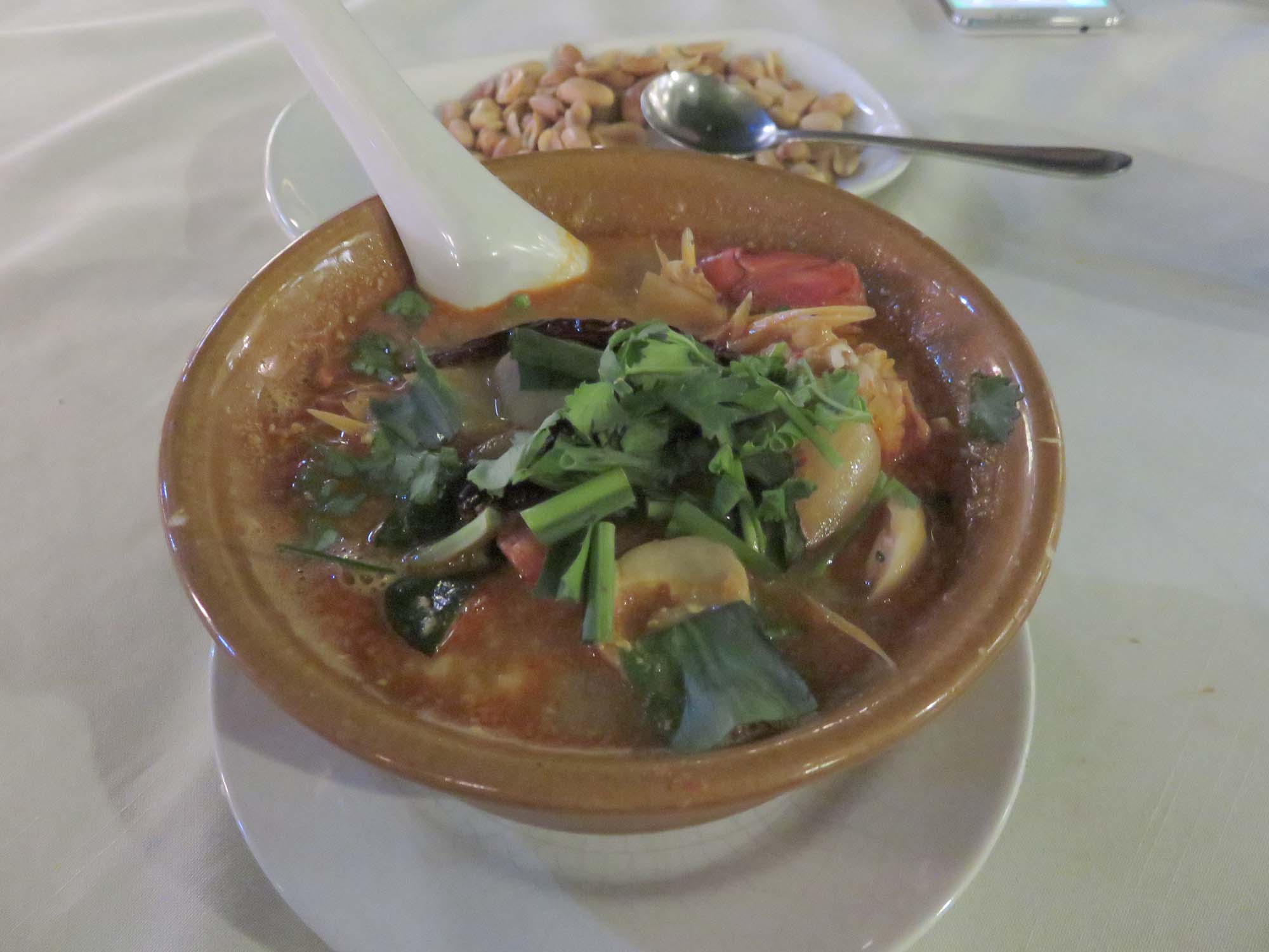 | お通しの煎餅 | トム クロン プラー ヌア オーン 210THB 魚のスープ。 それほど辛くないが、スパニカー の方が美味いらしい。 |