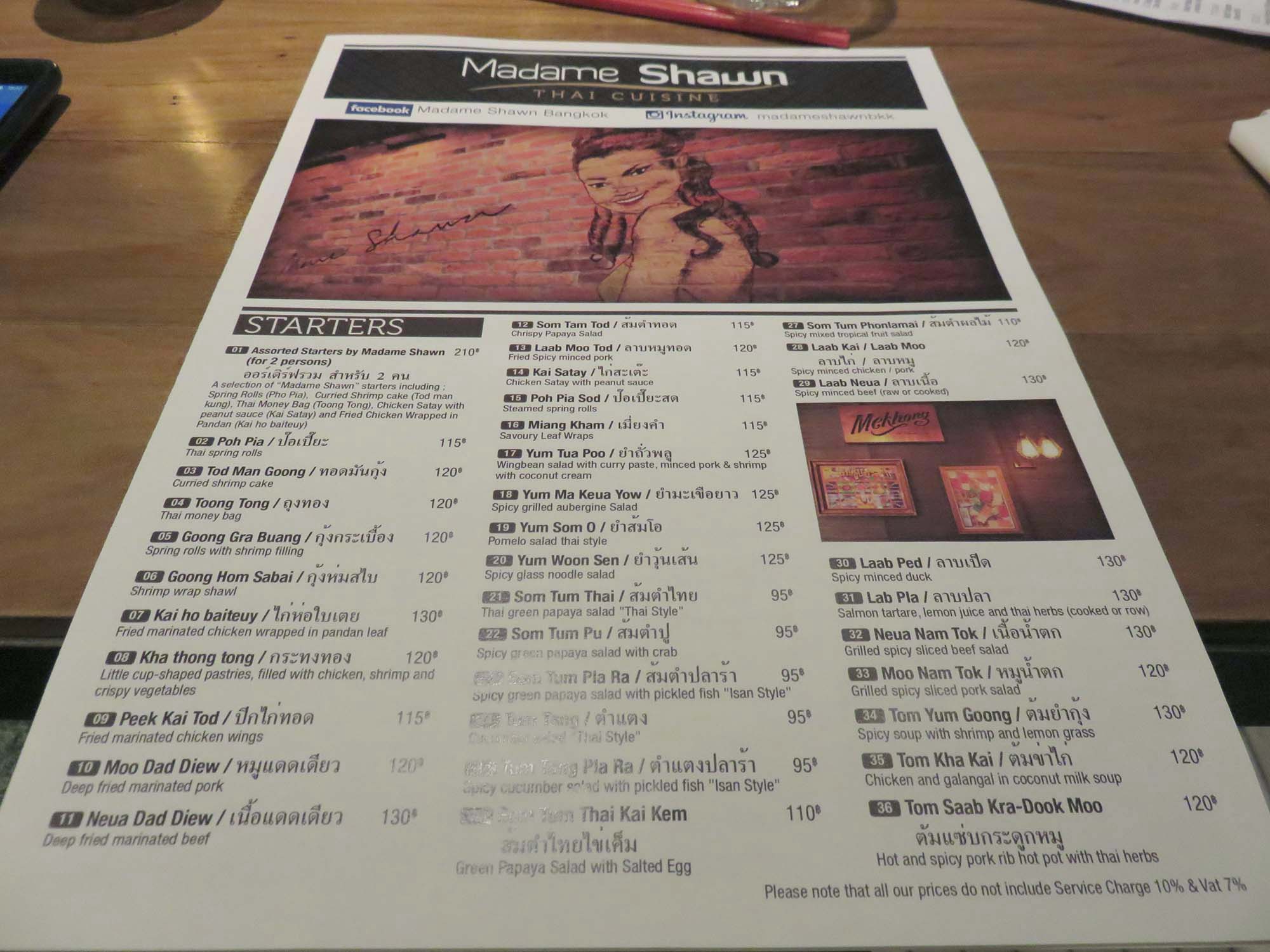 | 「塩」の跡地にできたタイ料理店。 | 店内は落ち着いた雰囲気。 | 料理はみな200THBと リーズナブル。 |
