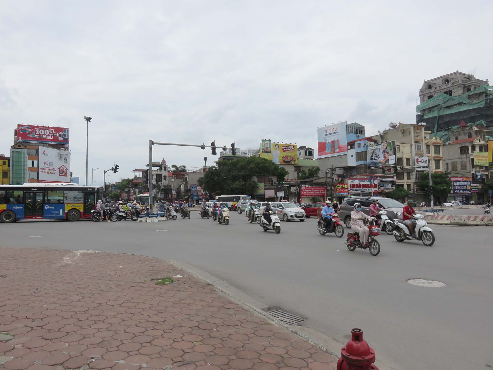 | ホント、ハノイの道路ってすごい。 自転車まで混じっている。 私たちが見ている前でも事故ったり していたので、事故率は相当な ものだろう。 |