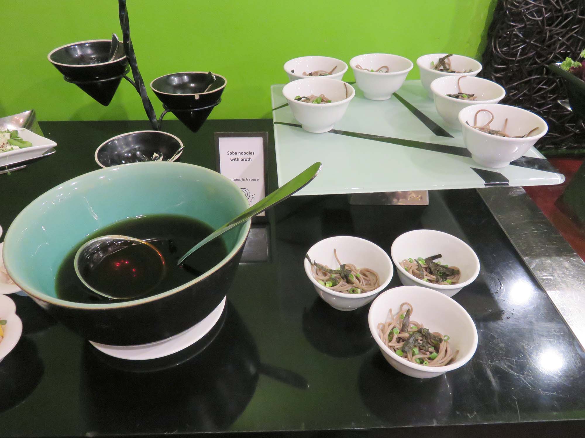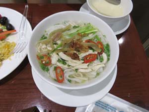 | ポタージュは美味くなかった。 | もちろんフォーもある。 そばに控えていた女性が来て 作ってくれた。係員が数人なにを たむろしているのかと 思っていたのだ。 |