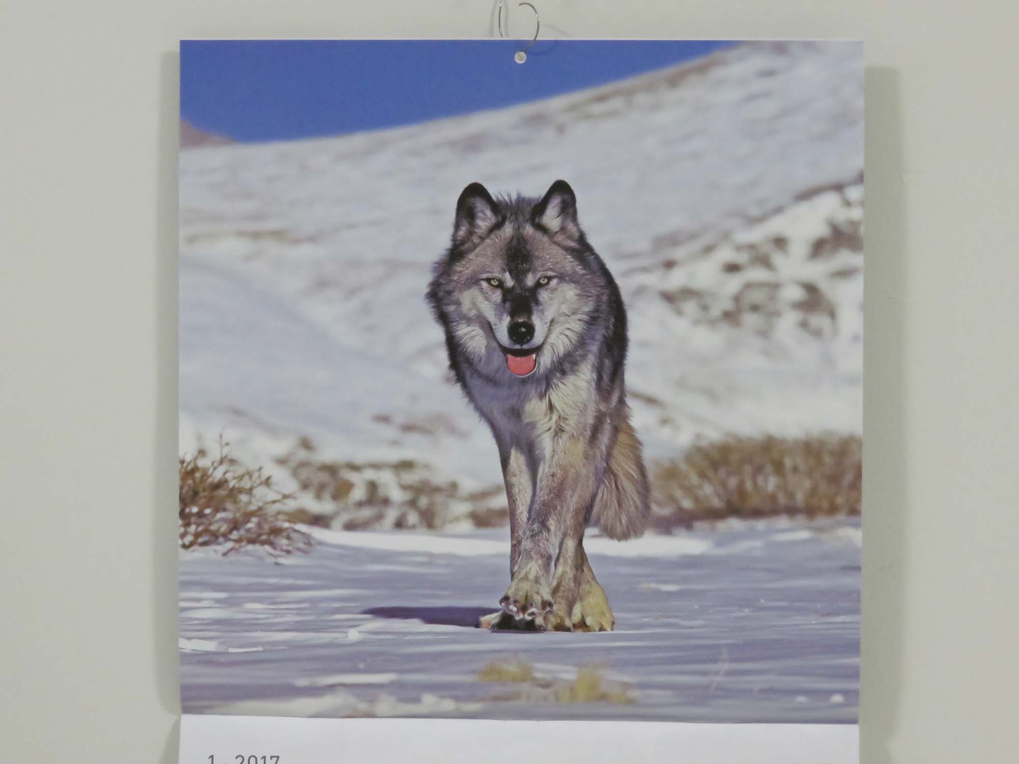 | 私は犬を飼い始めてから(その前は飛行機だった)は犬、ここ10年ほどは狼のカレンダーを買っているのだが、 今年の狼は大迫力だった。 |