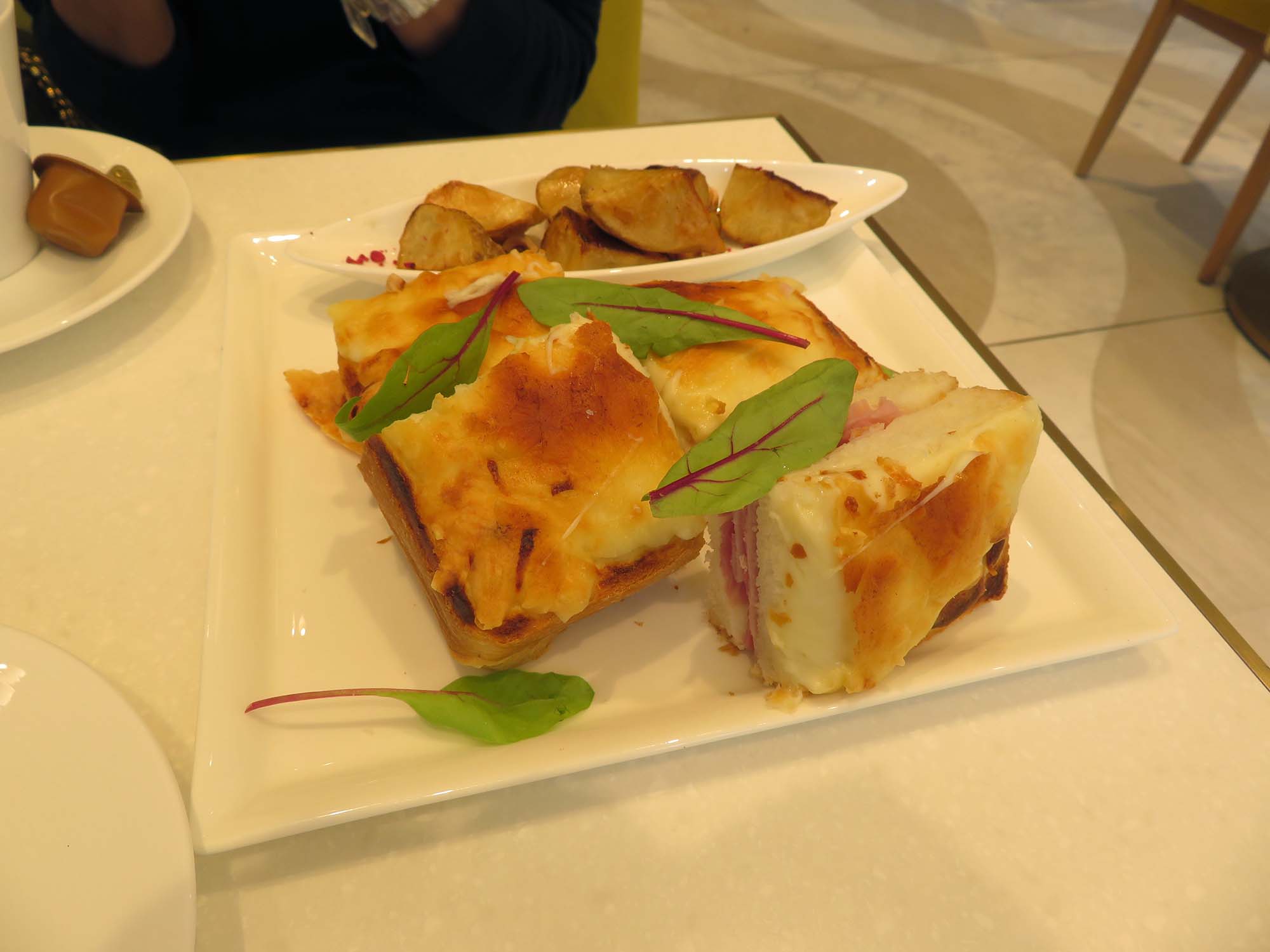 | G-SHOCKを見せびらかす妻。 | セットメニューのスープとパン。 | パリジャンクロックムッシュ 嫁さんはこれと下のブリュレの セットを選んだ。\2,450 |