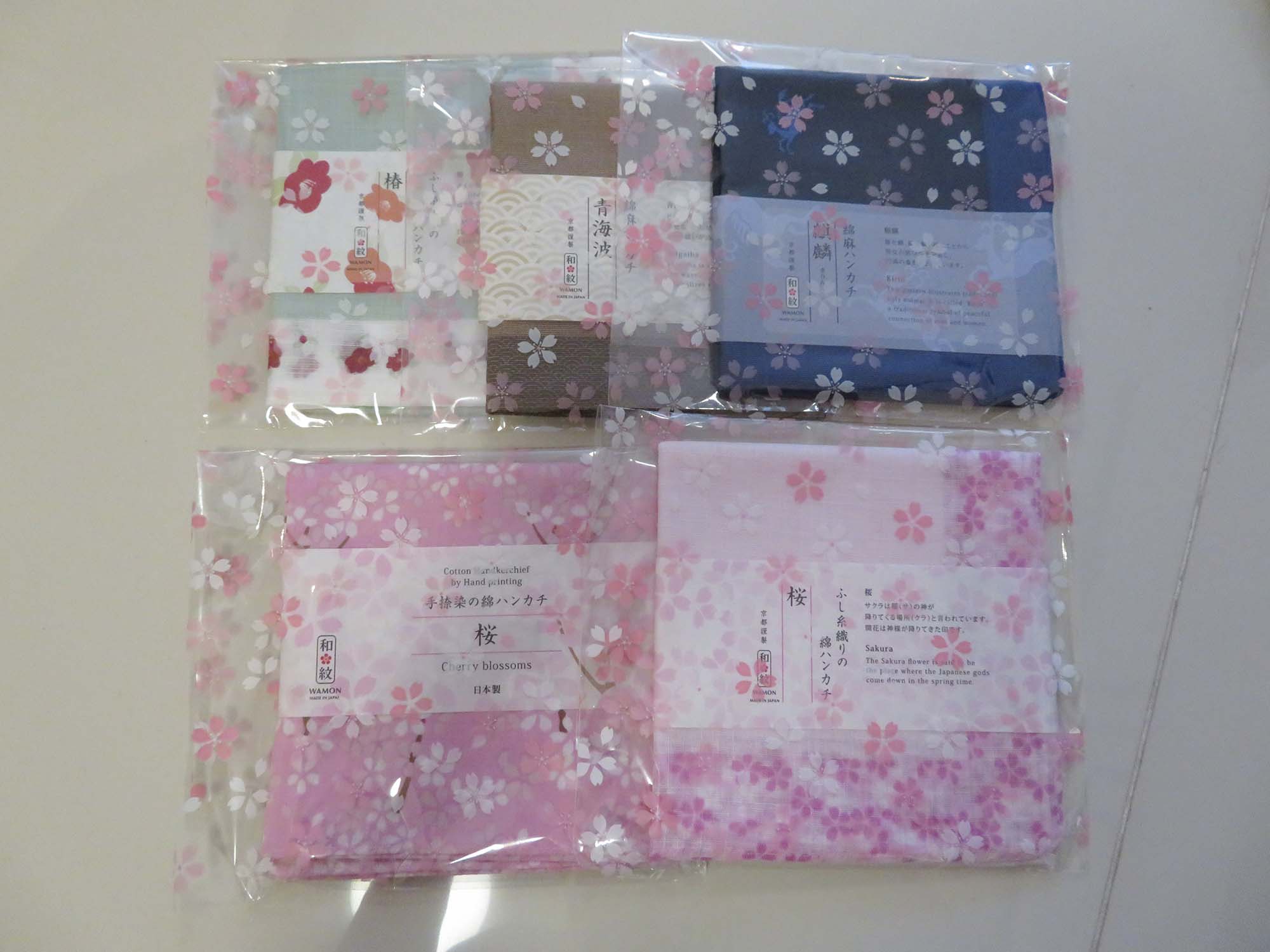 | 江戸小路では、和ハンカチを扱う店が豊富。 写真のものはどれも\600。 濱模様の商品を扱う店もあった。 |