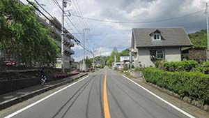 勝坂の交差点に向かう道を横切る。 | これがまがり坂を左に入ったところ。 |