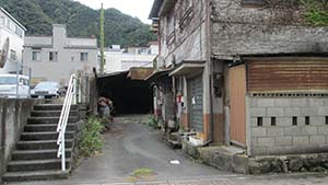 | 途中、廃れた施設に出会う。 丁度工事の標識で見えないが、 寝ている人がいた。 |