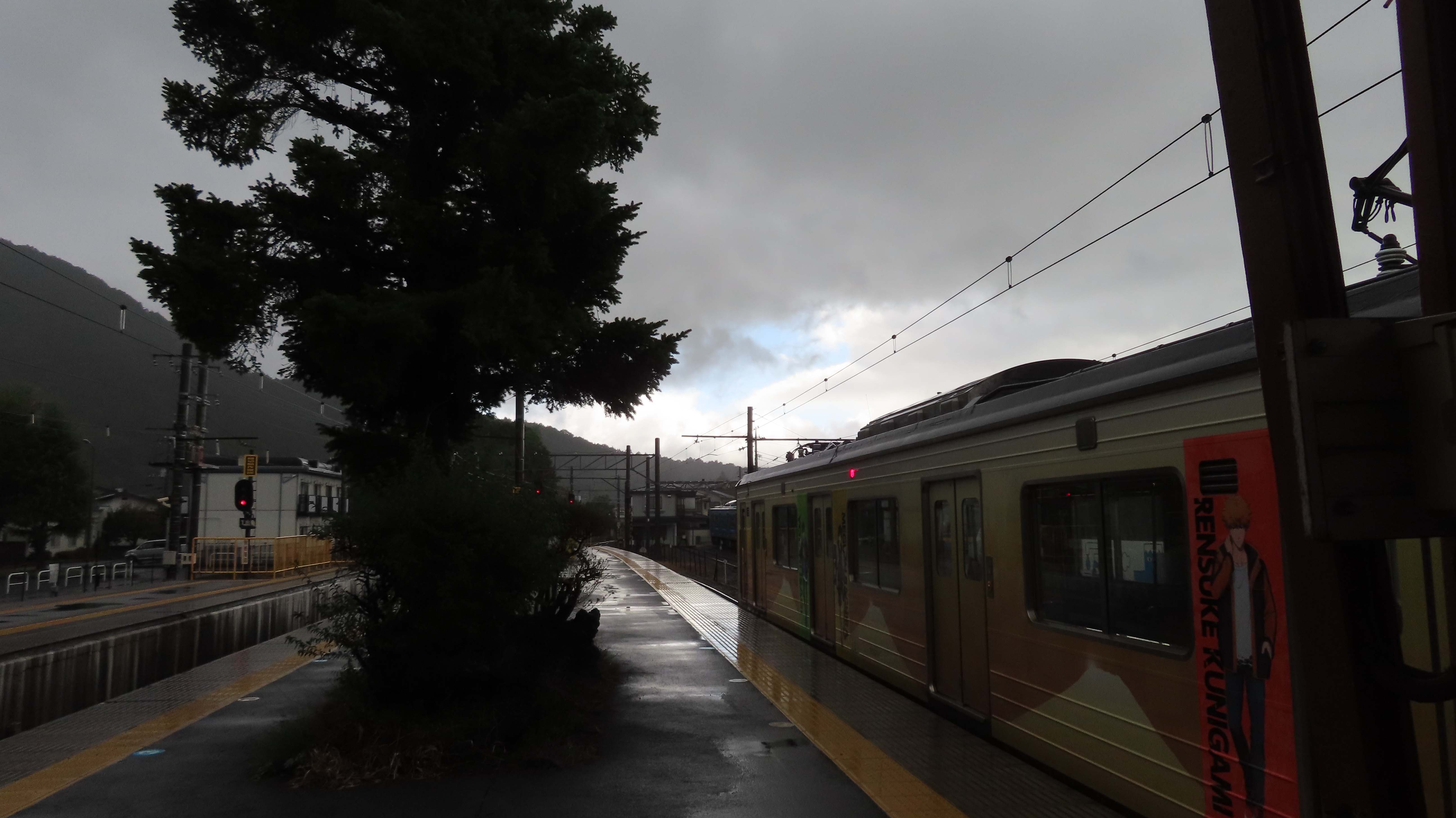 | いよいよ富士急線に乗る。 アニメ柄はみっともないが、 私の車ではないのでよしとしよう。 河口湖駅まで鈍行で きっかり1時間とのこと。 |