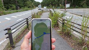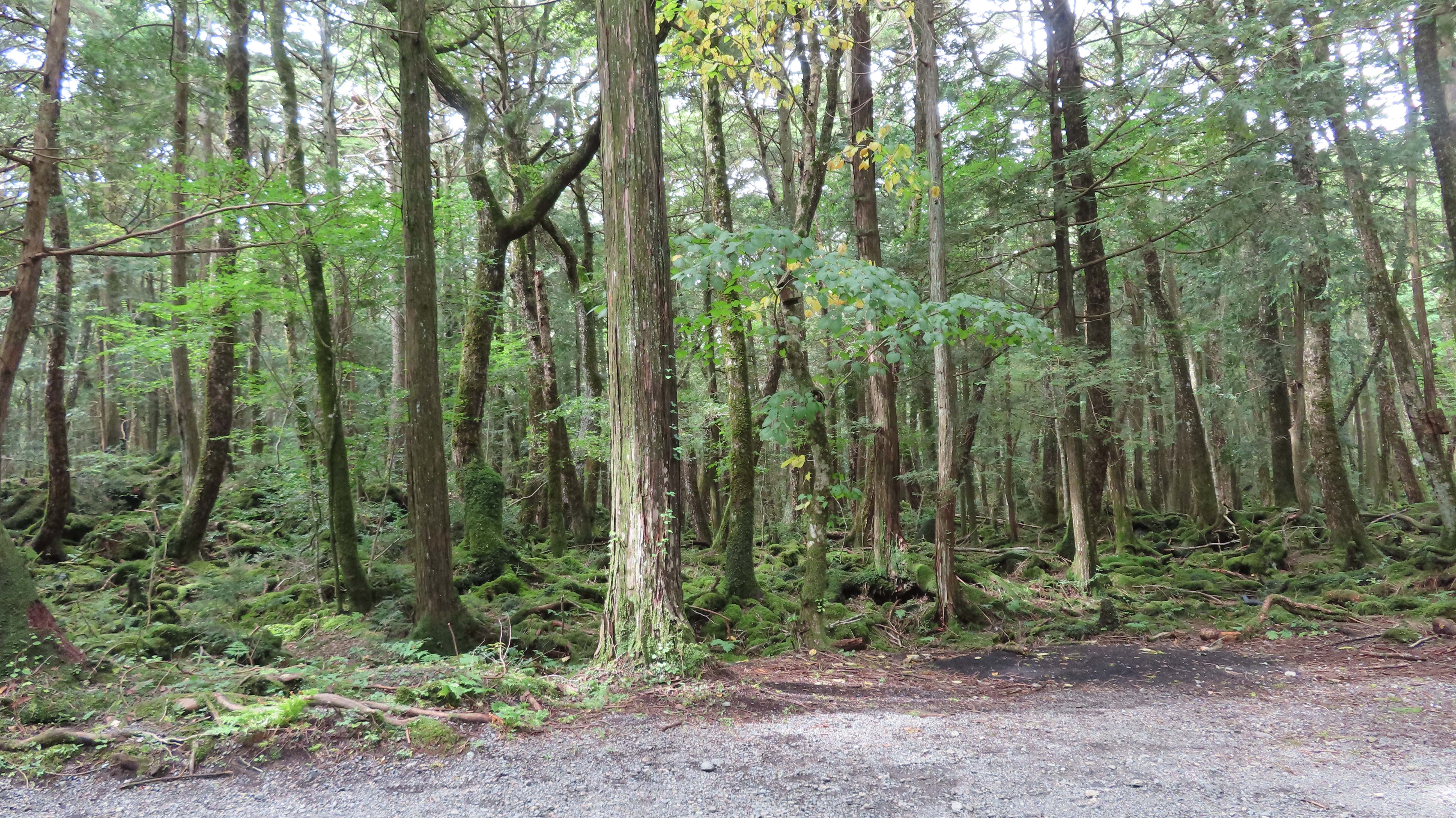 | 樹海内の道順らしい。 | 昨日の時点ではタクシーの運ちゃんと打ち合わせて、 洞窟の次は位置関係から富士山博物館に向かおうと考えていた。 そこで、タクシーの運ちゃんの入れ知恵で、富士急タクシーの電話番号を調べて 来てくれるか聞いたところ、風穴までは30〜40分で来れるが、 そこから富士山博物館は距離がないので貸切になるとのこと。 google mapで見ると歩いて42分とのこと。KDDIの電話は電波すら入らなかった。 天候的には晴れ間すら見えていたので、妻に相談して徒歩で向かうことにした。 |