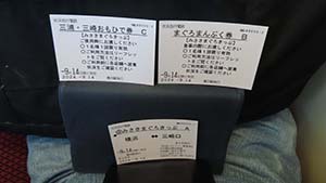 時期的には、10月以降は色々予定が詰まっていたので、 ちょっと暑かろうが9月に決行することにした。 そんなことを横須賀出身の先輩に話したところ、 みさきまぐろきっぷのことを教えてくれた。 このきっぷ、電車+バスの往復乗車券と食事券がセットになっているらしい。 食事券というのはちょっと変わっていて、割引券ではなく、 それ用に店側が用意する料理との引換券のようなのだ。 見たところ、\2,000程度のメニューのようだった。 このきっぷを買ってぶらっと行くのは得策ではない。 あらかじめ何件か候補の店を絞った方が良い。 混んでいたら入れないからだ。 調べたうえで利用するのであれば得なきっぷと思われた。 |