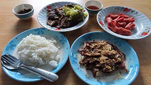 | これがゴムの木 | 「グラップカーオ(おかず)」といって 売りに来る車。日に何度も来るが、 数年前はこんなのいなかった。 |