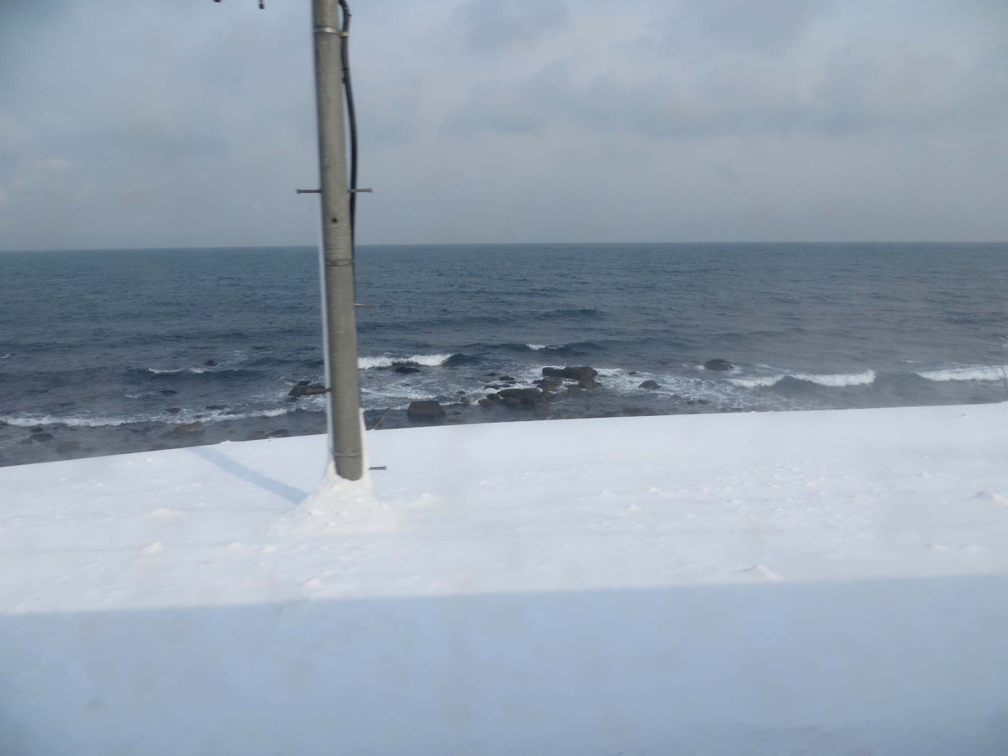 | 車窓から JR千歳線〜函館線 雪に覆われた海は圧巻だった。寒そうどころの話ではなかった。 |
