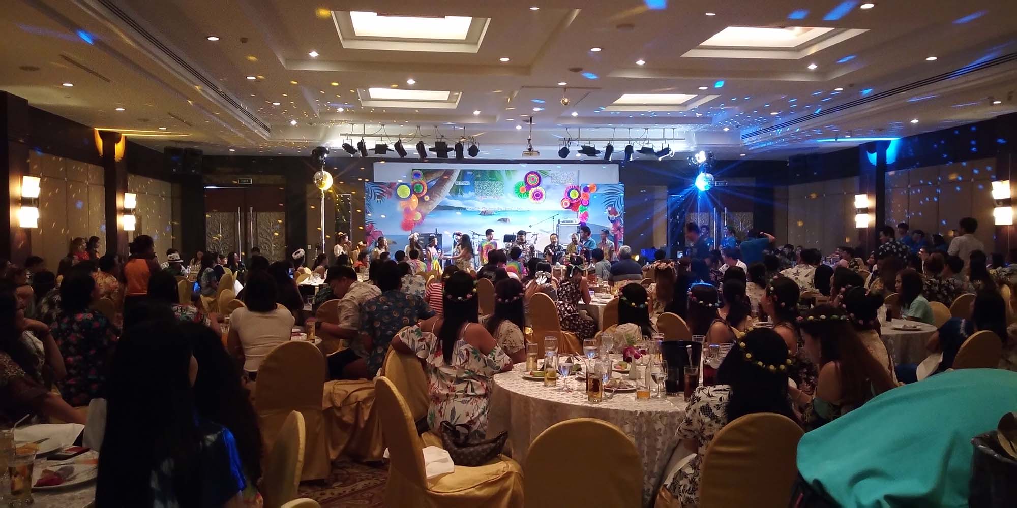 | パーティ会場 | 21時を過ぎるとディスコに変貌。 エアコンが効きすぎであり、 私は早々に退散した。 これが原因か定かではないが、 日をまたいで 火曜日には風邪を引いた。 |